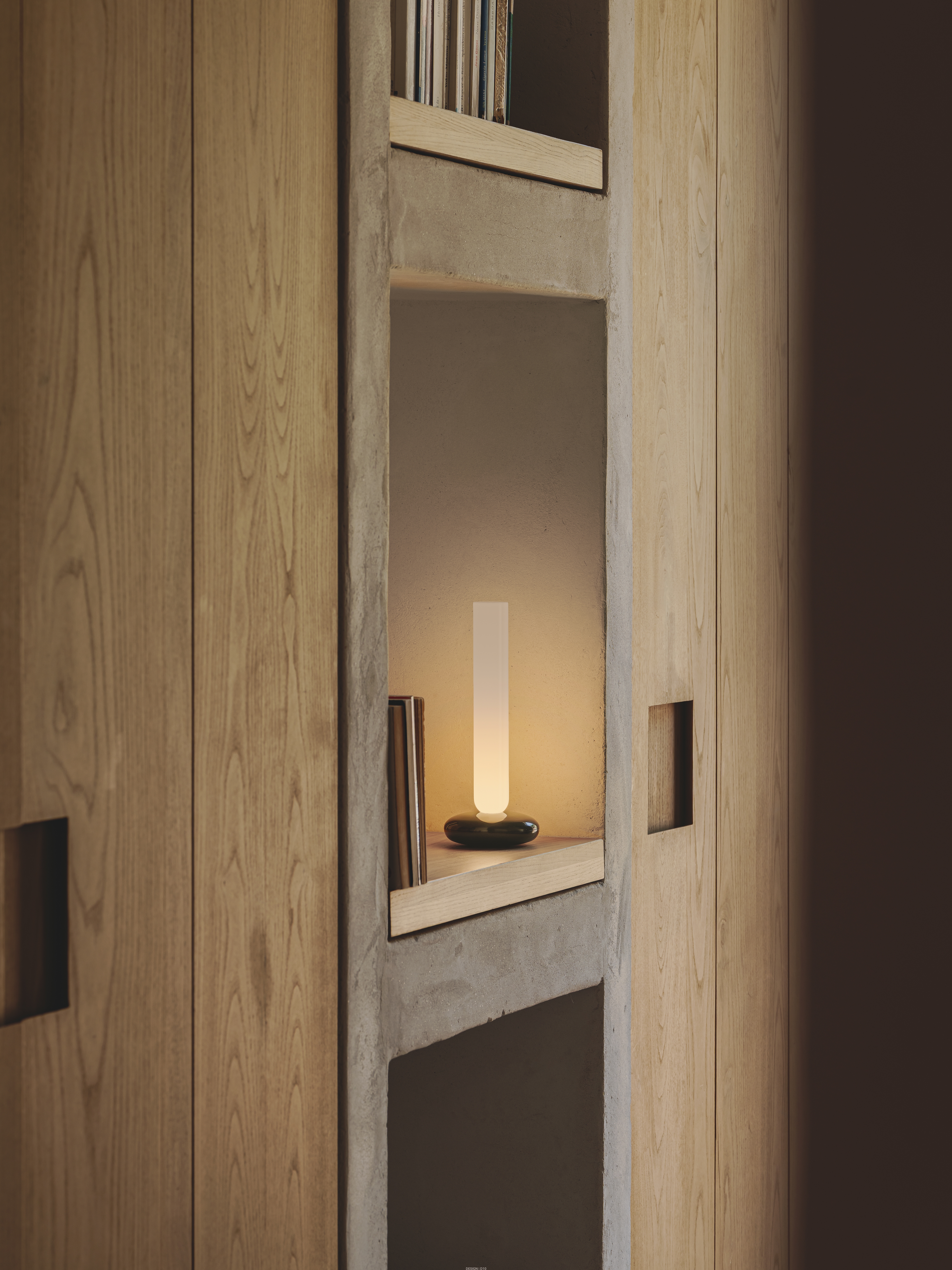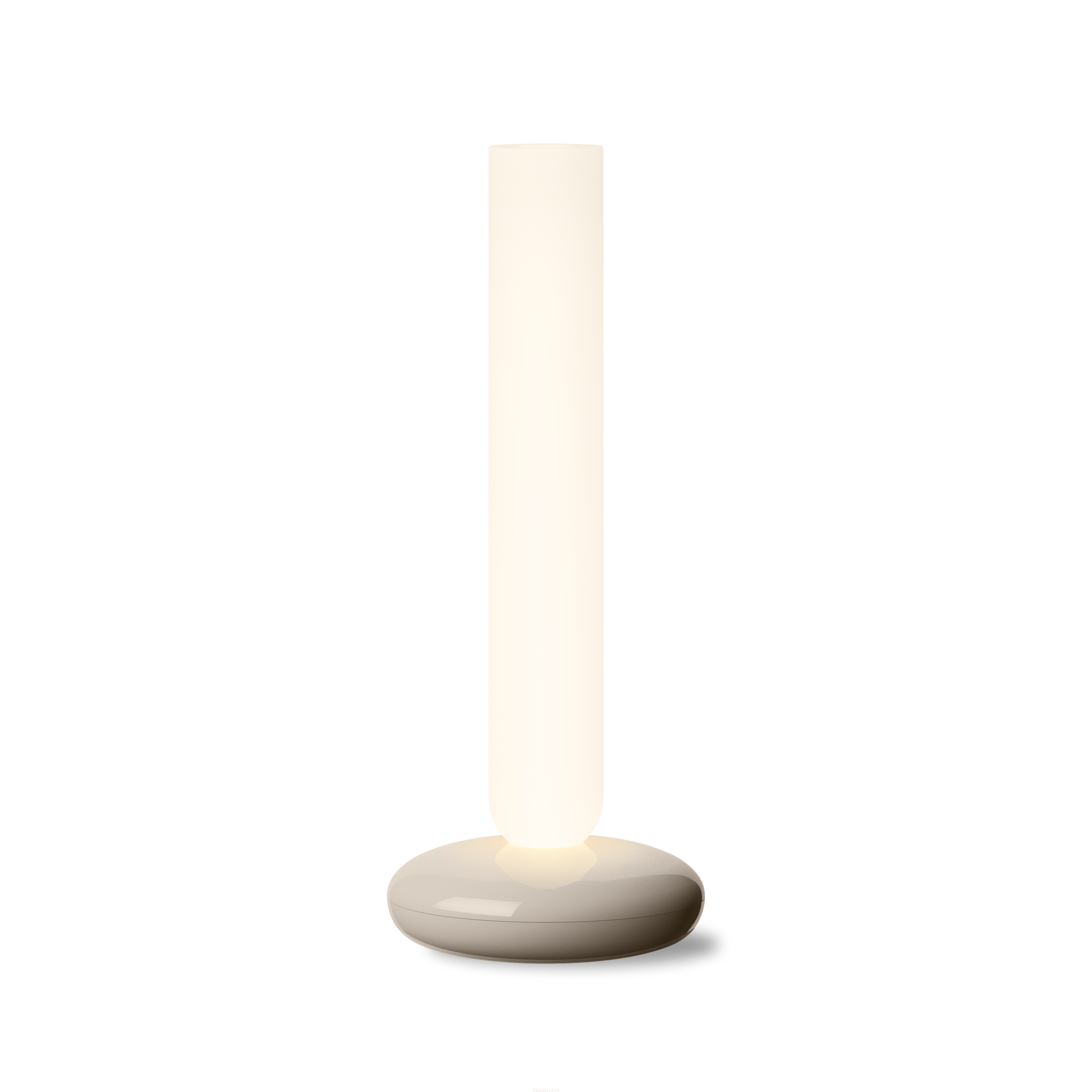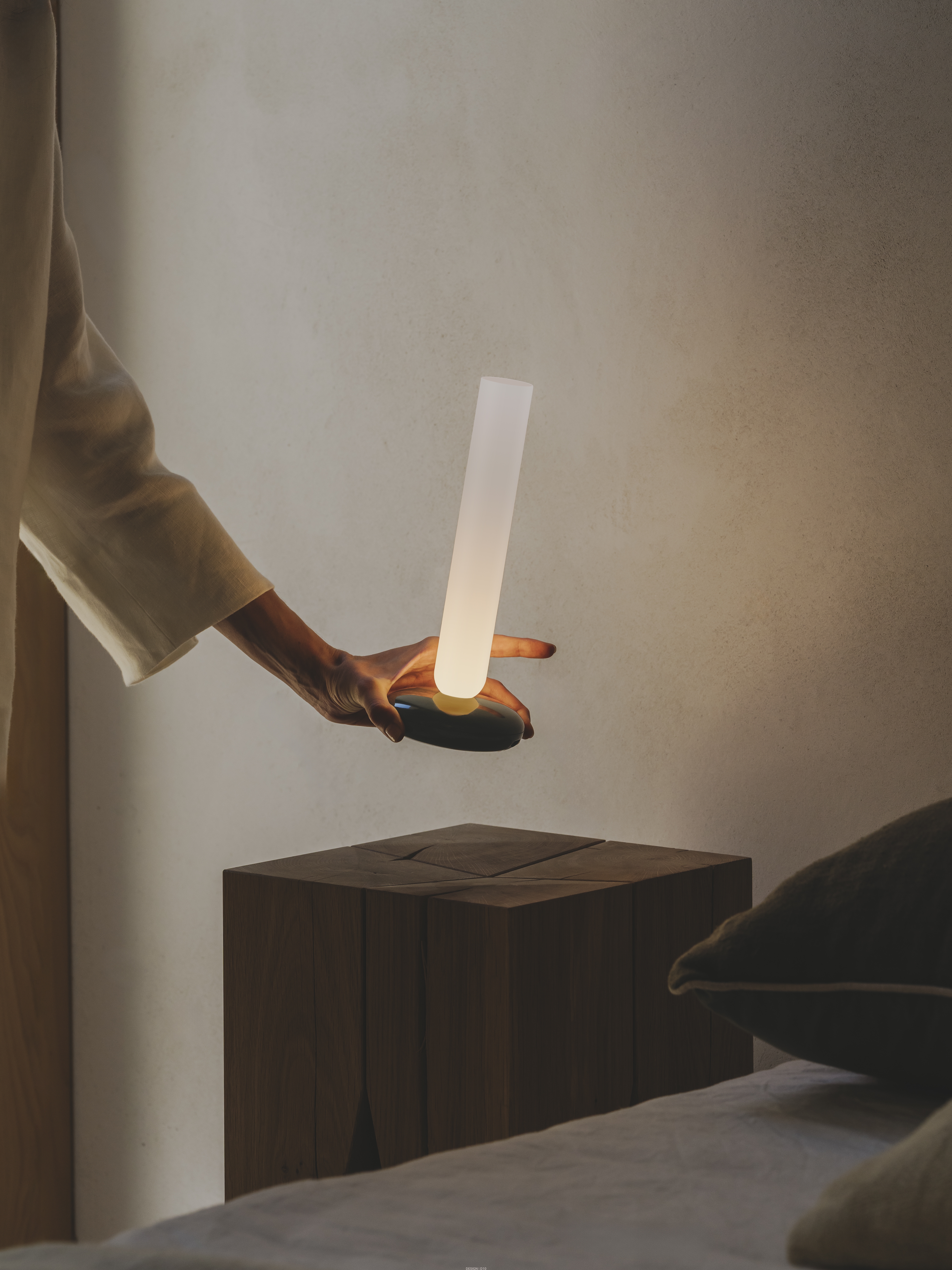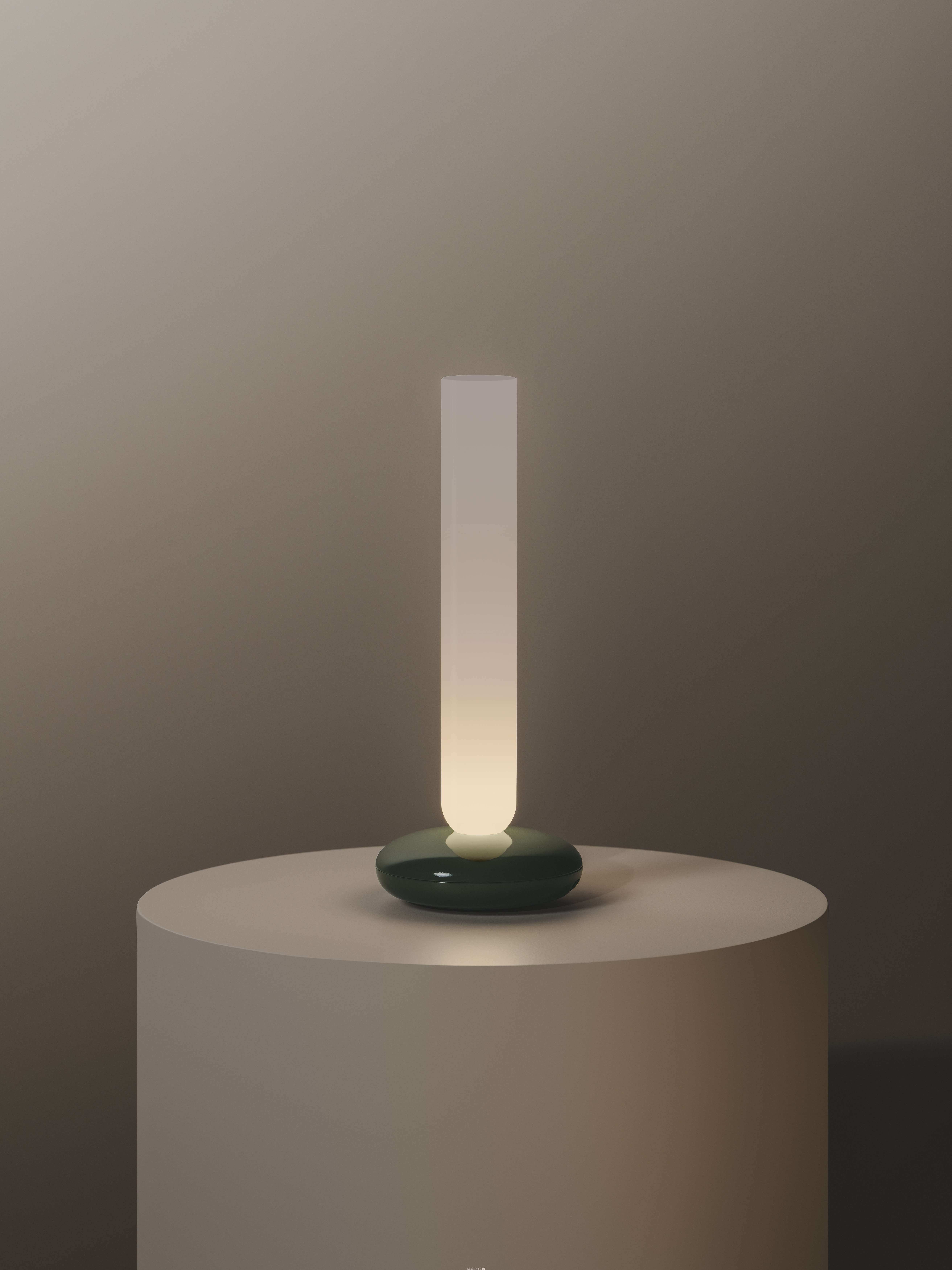 Alba przywołuje pierwsze światło świtu dzięki dwóm harmonijnie połączonym elementom: świecącemu cylindrycznemu kloszowi i odbijającej światło okrągłej podstawie, które stykają się w subtelnym punkcie styku. Uchwyca ona moment, w którym słońce wydaje się dotykać horyzontu tuż przed wschodem, łącząc formę i światło w płynnym, precyzyjnym geście.