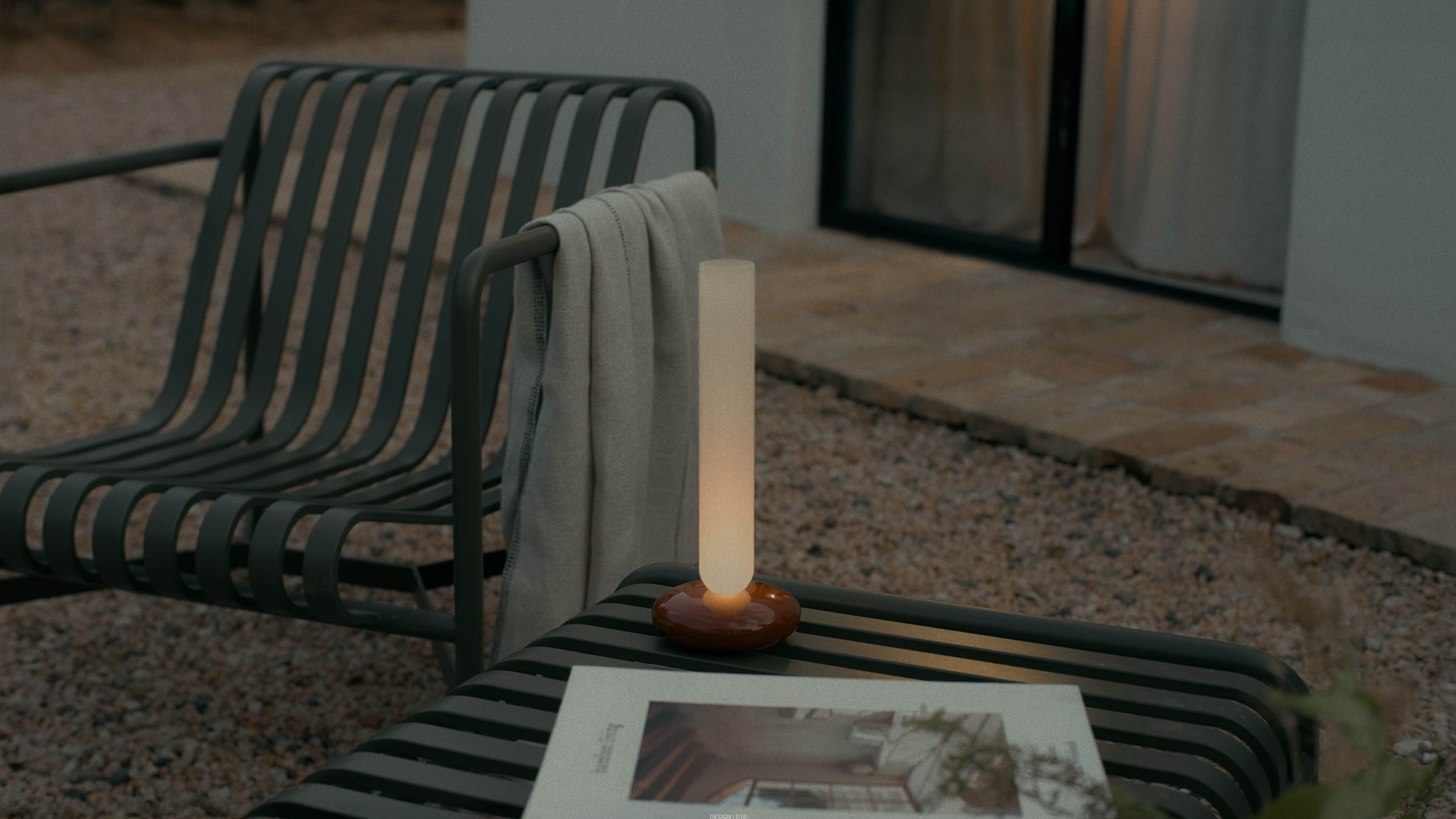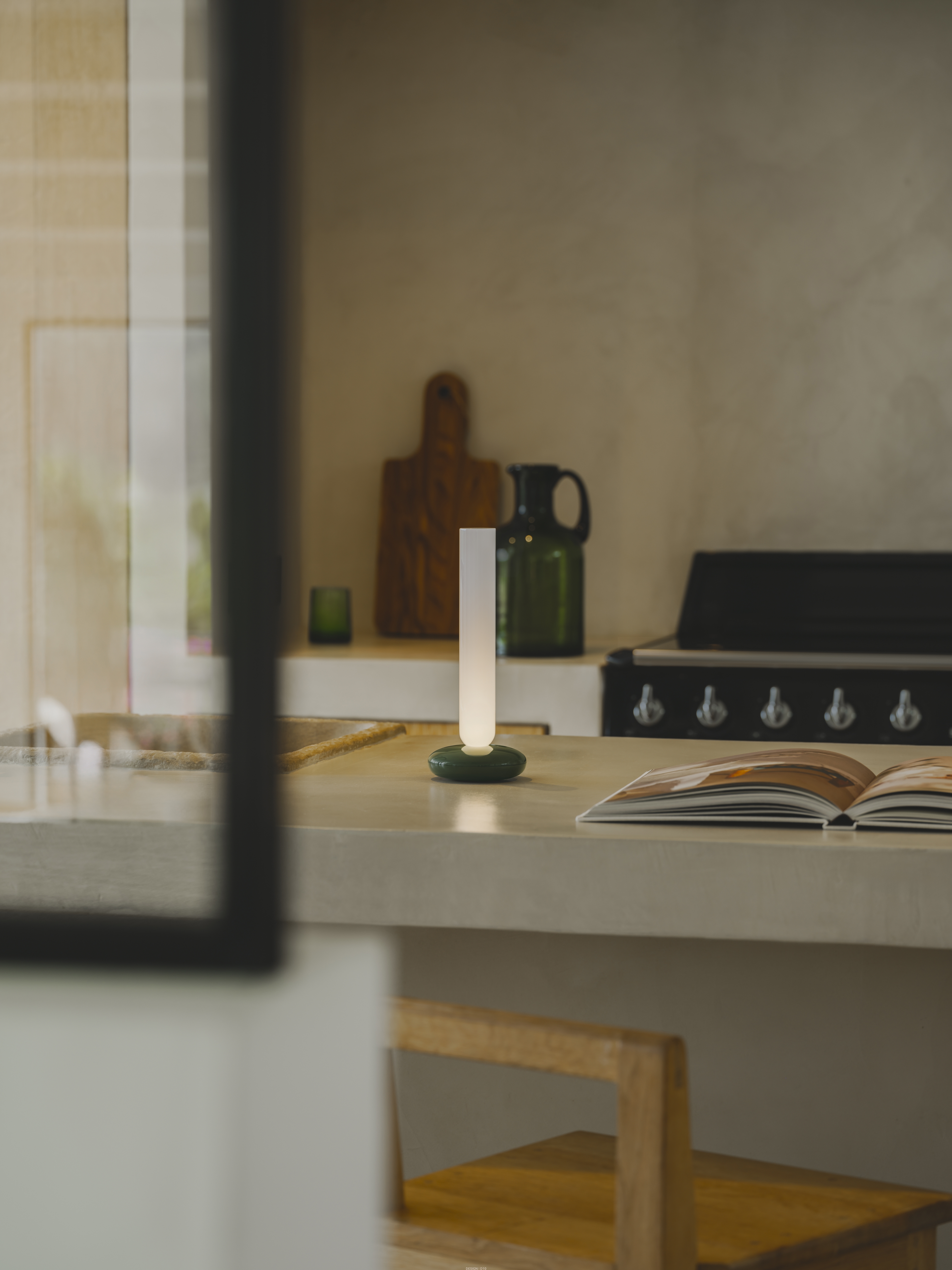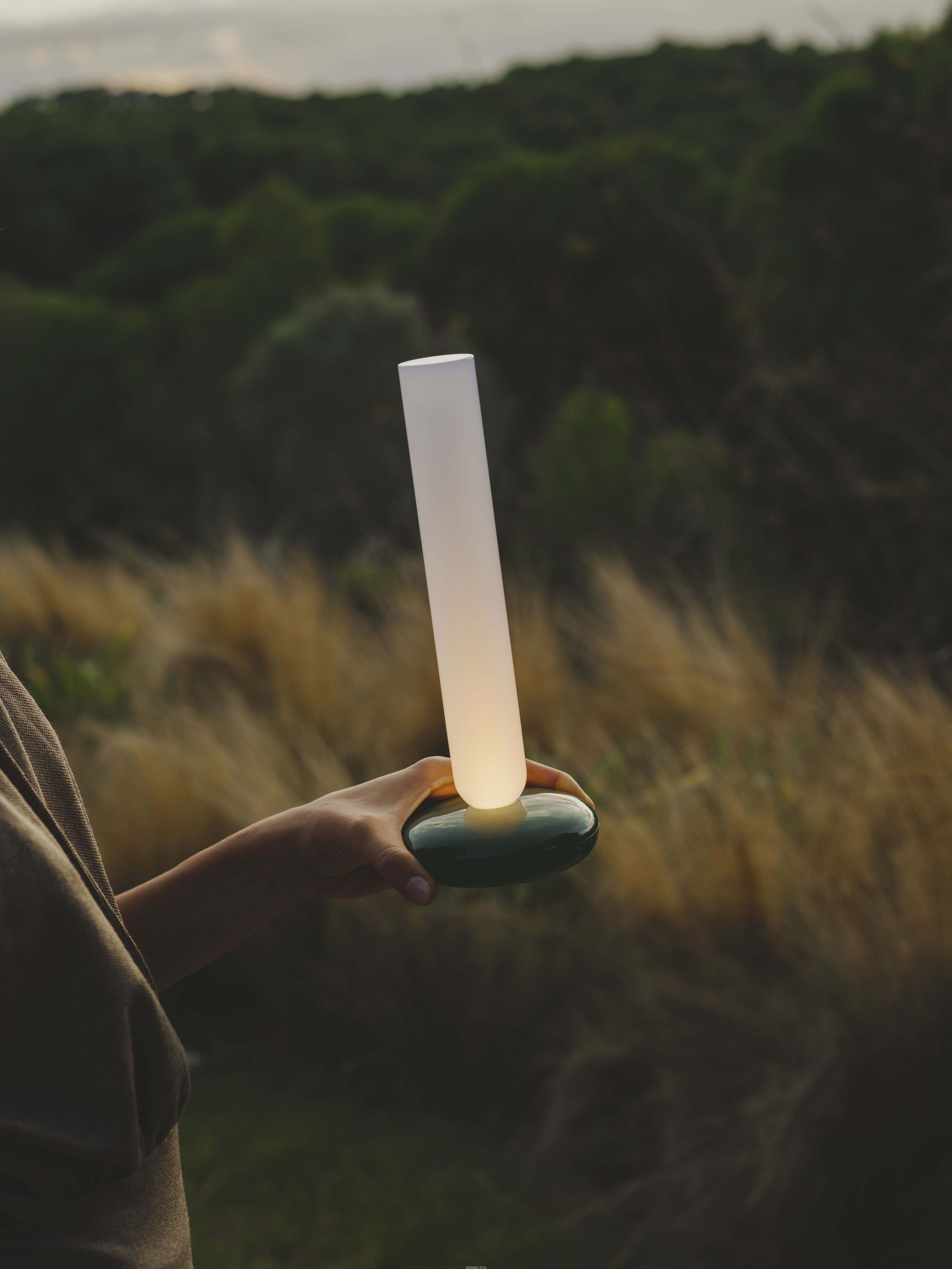 Alba przywołuje pierwsze światło świtu dzięki dwóm harmonijnie połączonym elementom: świecącemu cylindrycznemu kloszowi i odbijającej światło okrągłej podstawie, które stykają się w subtelnym punkcie styku. Uchwyca ona moment, w którym słońce wydaje się dotykać horyzontu tuż przed wschodem, łącząc formę i światło w płynnym, precyzyjnym geście.