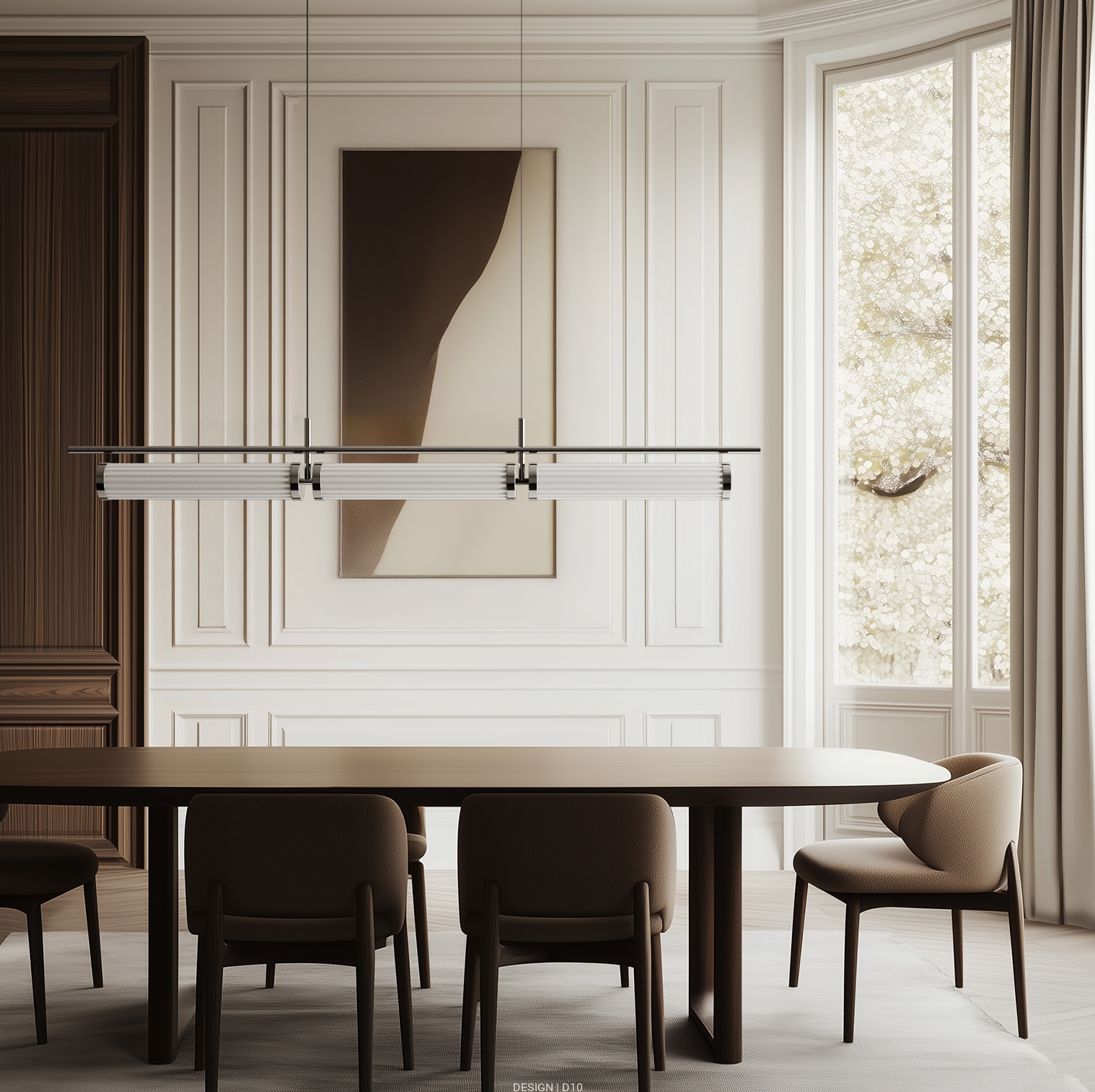 Numu to nowoczesne ujęcie klasycznej elegancji w którym główną rolę odgrywa połączenie metalowej konstrukcji z lekkimi prążkowanymi kloszami ze szkła. Skrywają one zintegrowane moduły LED które emitują delikatne i miękkie światło podkreślając teksturę szkła.