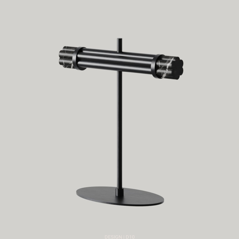 Wykonanie: podstawa i konstrukcja z metalu o kolorze matowy czarny / postarzane złoto, końcówki marmurowe o kolorze białym / czarnym / zielonym / brązowym