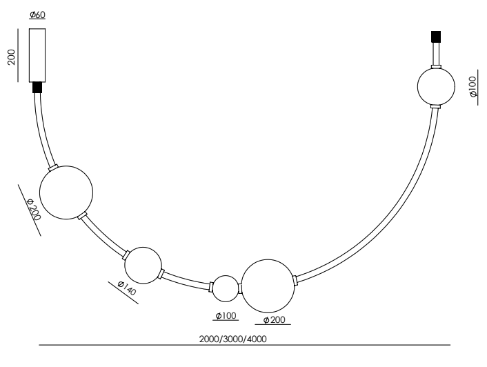 Wykonanie: Konstrukcja z metalu o kolorze czarny matowy / postarzane złoto, silikonowa tuba 3 m, marmurowa kula o kolorze biały / czarny / brązowy / zielony, metalowa kulka o kolorze czarnym / złotym / chromowym, szklana kula czysta lub dymiona na szaro.