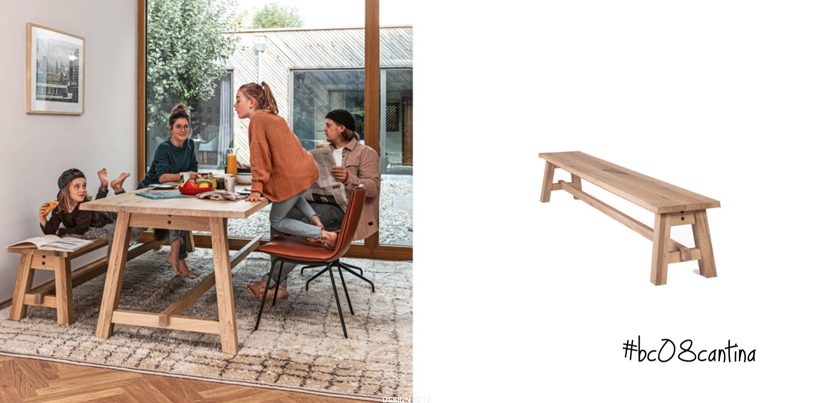 Nowoczesne podejście do tradycyjnego życia — po sukcesie stołu BC 02 CANTINA, stworzono ławkę BC 08 jako jego rustykalny towarzysz. Bez względu na okazję, BC 08 Cantina zaprojektowano tak, aby wszystko było w porządku. A jeśli do stołu zaprosisz niespodziewanych gości, ten niezawodny duet sprawdzi się bez wachania.