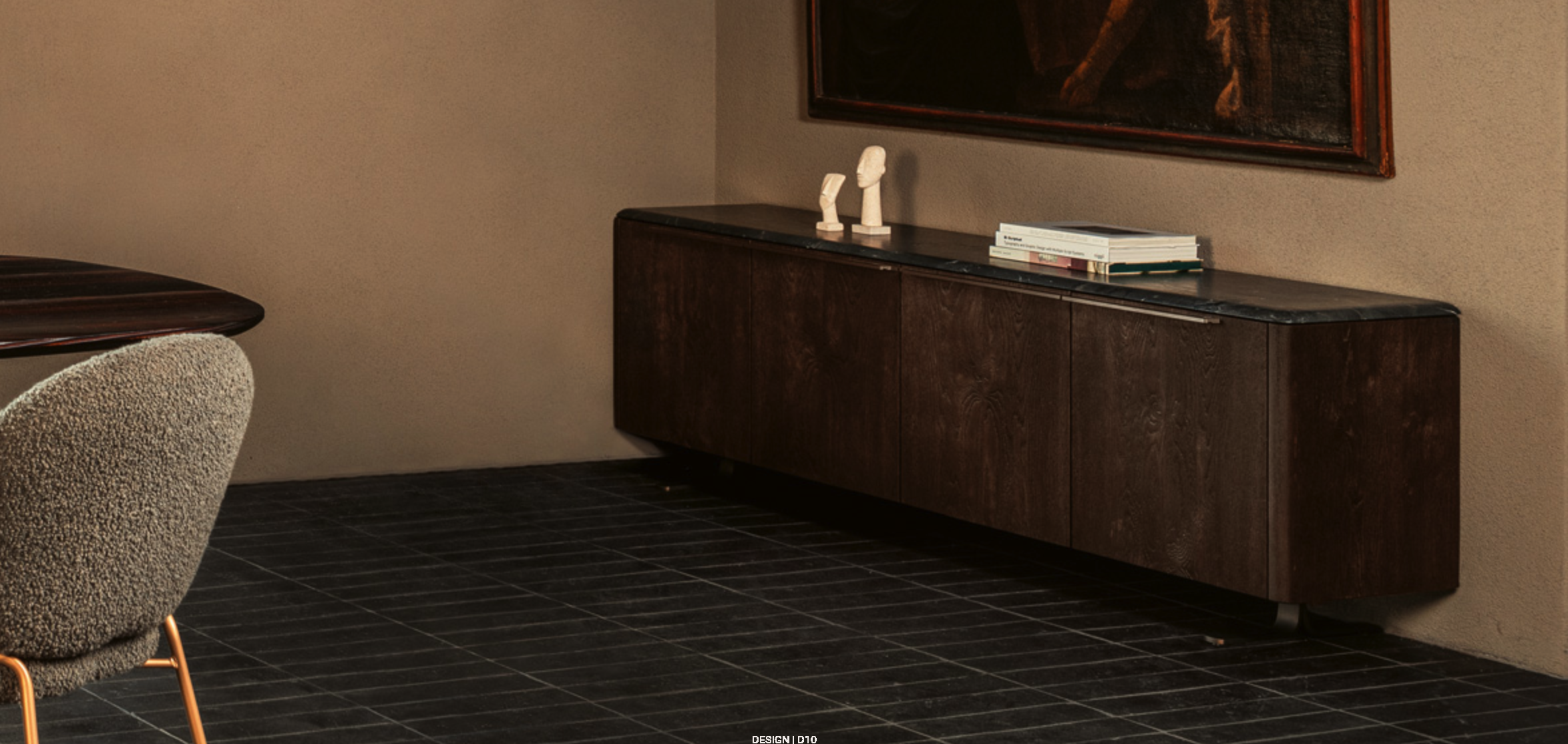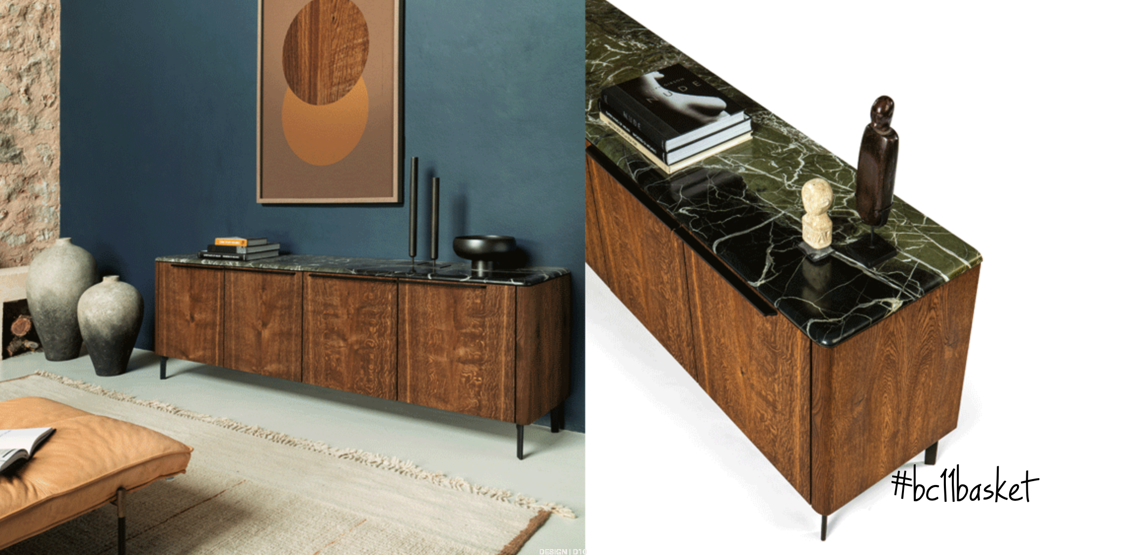 Komoda Basket jest rozwinięciem serii stołów. Łączy je kamienna płyta o grubości 2 cm z pięknie zaokrągloną krawędzią z kamienia. Dostępna jest delikatna wersja na 4 nogach lub eleganckie płozy. Aby fronty były całkowicie wolne od zniekształceń, wykonano je z 5-warstwowej płyty z litego drewna z wierzchnią warstwą o grubości 5 mm. Dzięki temu możliwe jest np. stworzenie odbicia lustrzanego frontu i tym samym nadanie meblom niepowtarzalnego wyglądu.