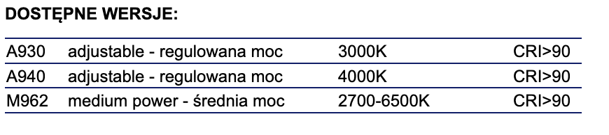 Dostępna temperatura barwowa: 3000K/4000K/2700-6500K