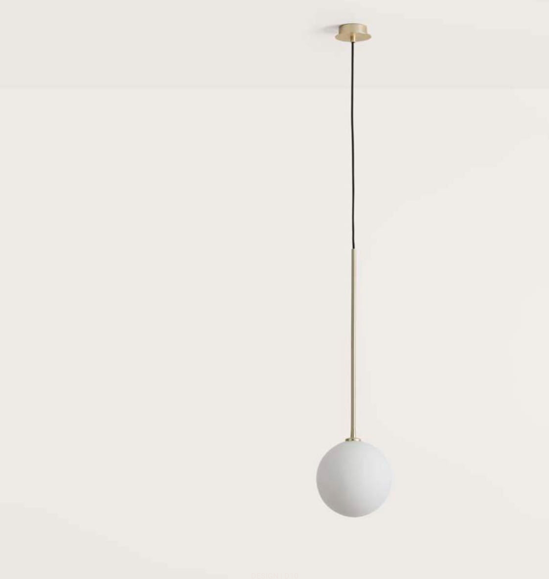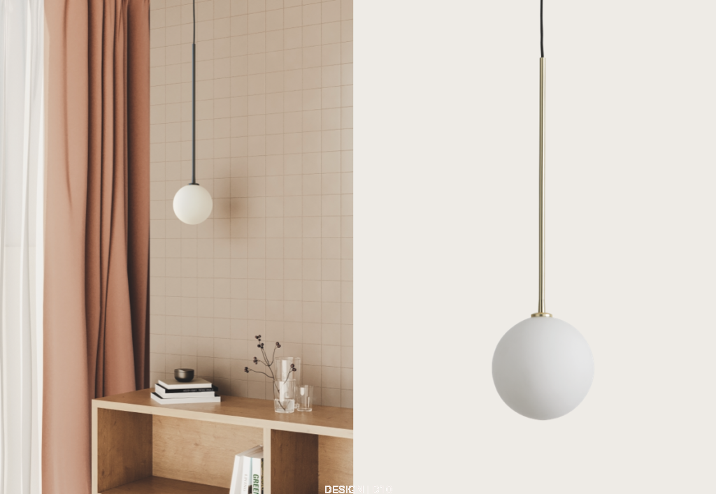 Lampa wisząca o minimalistycznej konstrukcji, składająca się z mosiężnej rurki zawieszonej na czarnym kablu zwieńczonej opalowym kloszem przywodzącym na myśl piłkę. Oryginalna i jednocześnie prosta forma lampy sprawia, że będzie ona ciekawym akcentem w każdym wnętrzu. Dostępna w opcji czarnej oraz matowym mosiądzu.