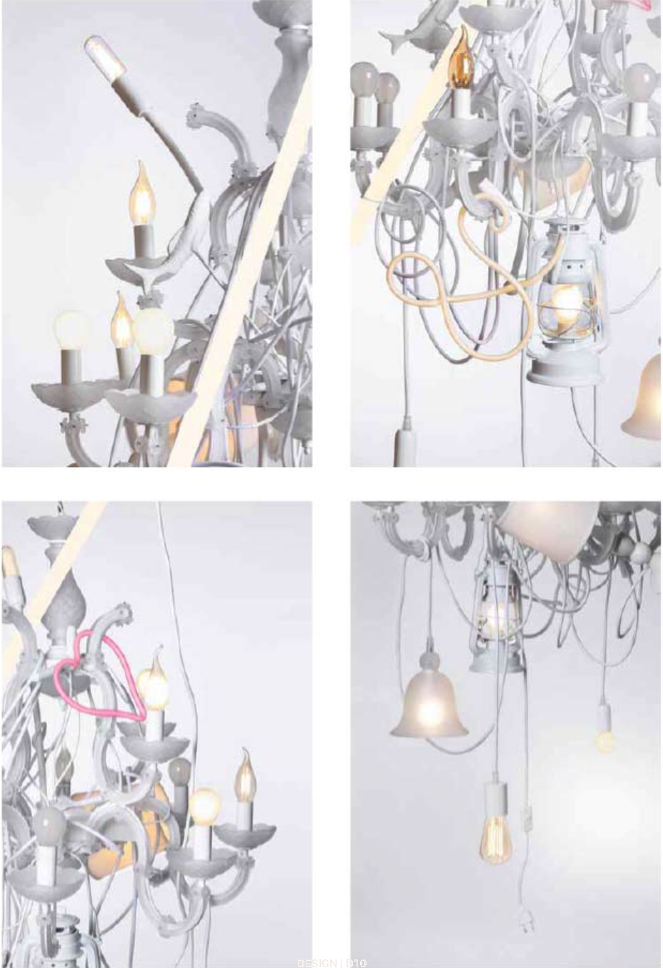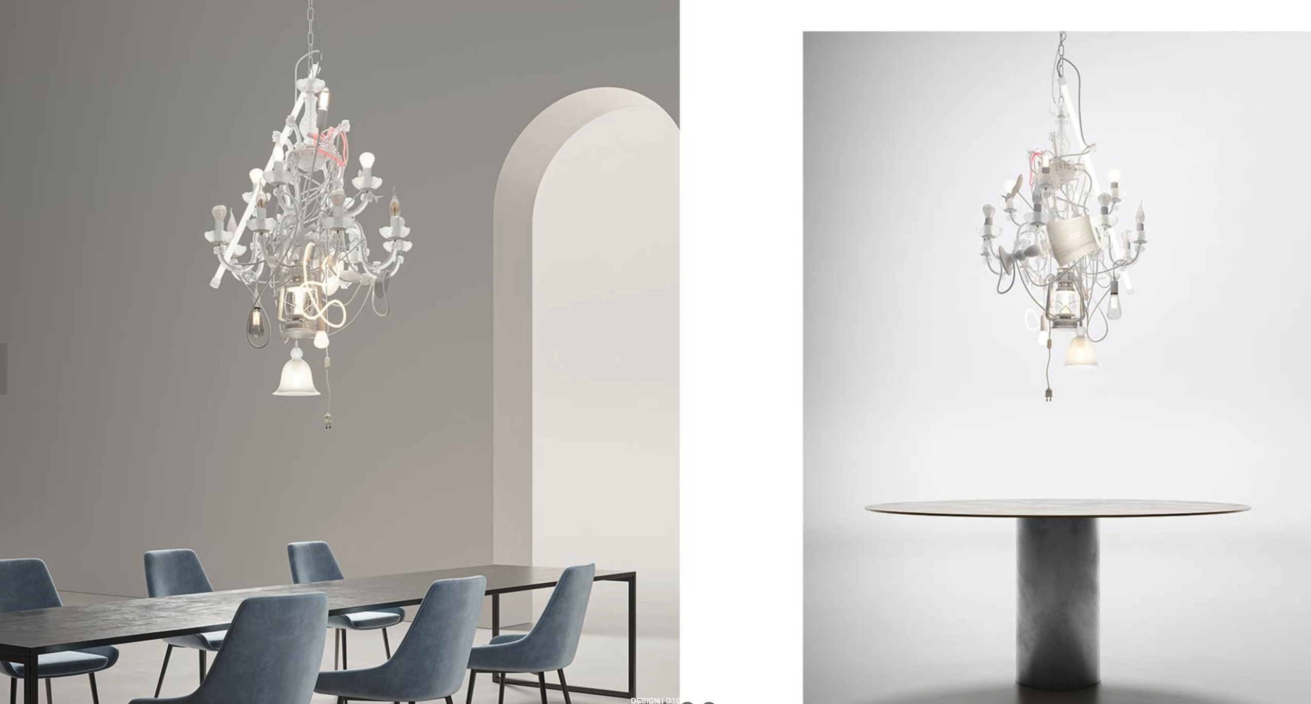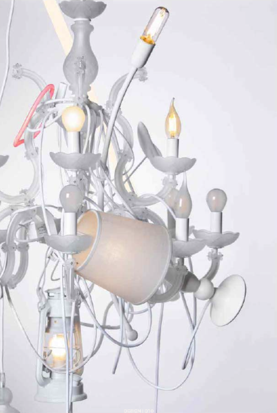 Wszystkie kanoniczne elementy są tutaj – konstrukcja nośna, ramiona, lampy i kabel – ale lekceważące podejście Marcantonio na pograniczu, gdzieś pomiędzy sztuką a designem, powołało do życia nową, zdekonstruowaną sylwetkę, stworzoną przez mieszanie kształtów, materiałów i stylów, a wszystko to najwyraźniej przynależy do obszaru semantycznego oświetlenia, choć pochodzi z różnych czasów i miejsc. Z centralnej konstrukcji z białego metalu wyłania się wiele ramion z dmuchanego szkła Murano z białym matowym wykończeniem; na stawach znajdują się rozety z kryształu z Czech, skradzione z tradycji weneckiej z połowy XVIII wieku. Jako idealne wisiorki projektantka umieściła lampę gazową, klasyczną lampkę nocną z materiałowym abażurem, szklany dzwonek, lampę na giętkim ramieniu, a nawet neonowy bar w stylu lat 80. W mieszance nie brakuje też małych „intruzów”, takich jak skacząca ryba w szkle i różowe neonowe serce, które stanowią jedyną nutę koloru.