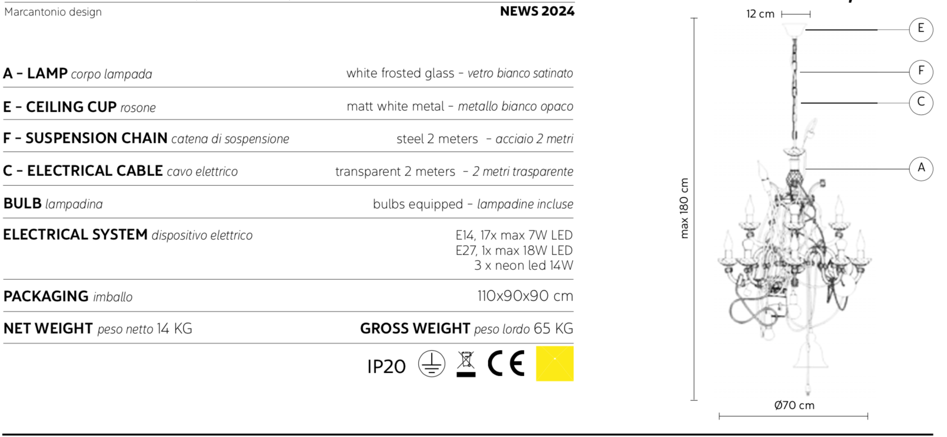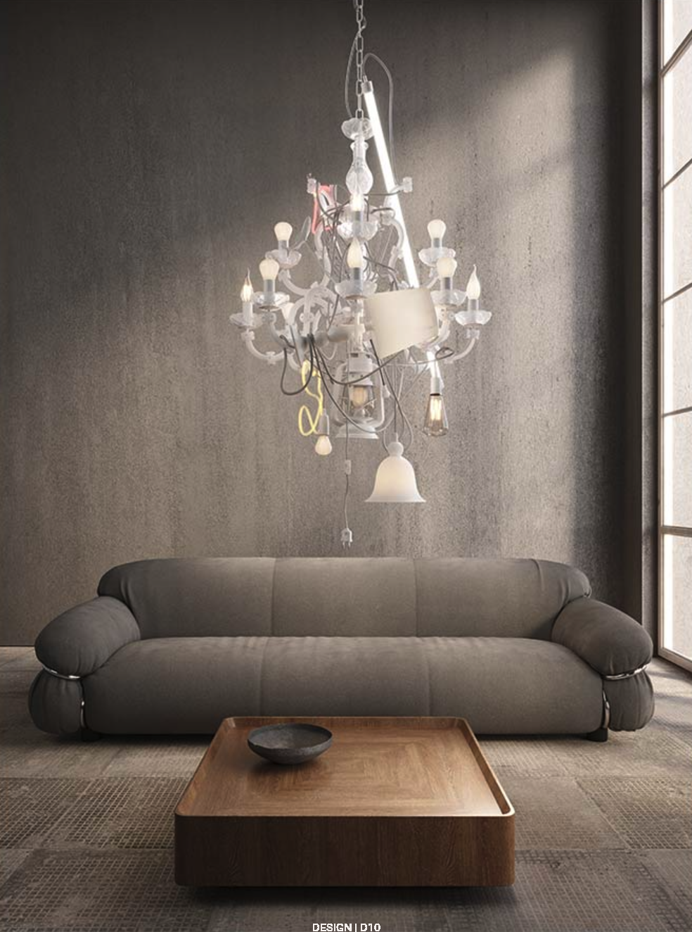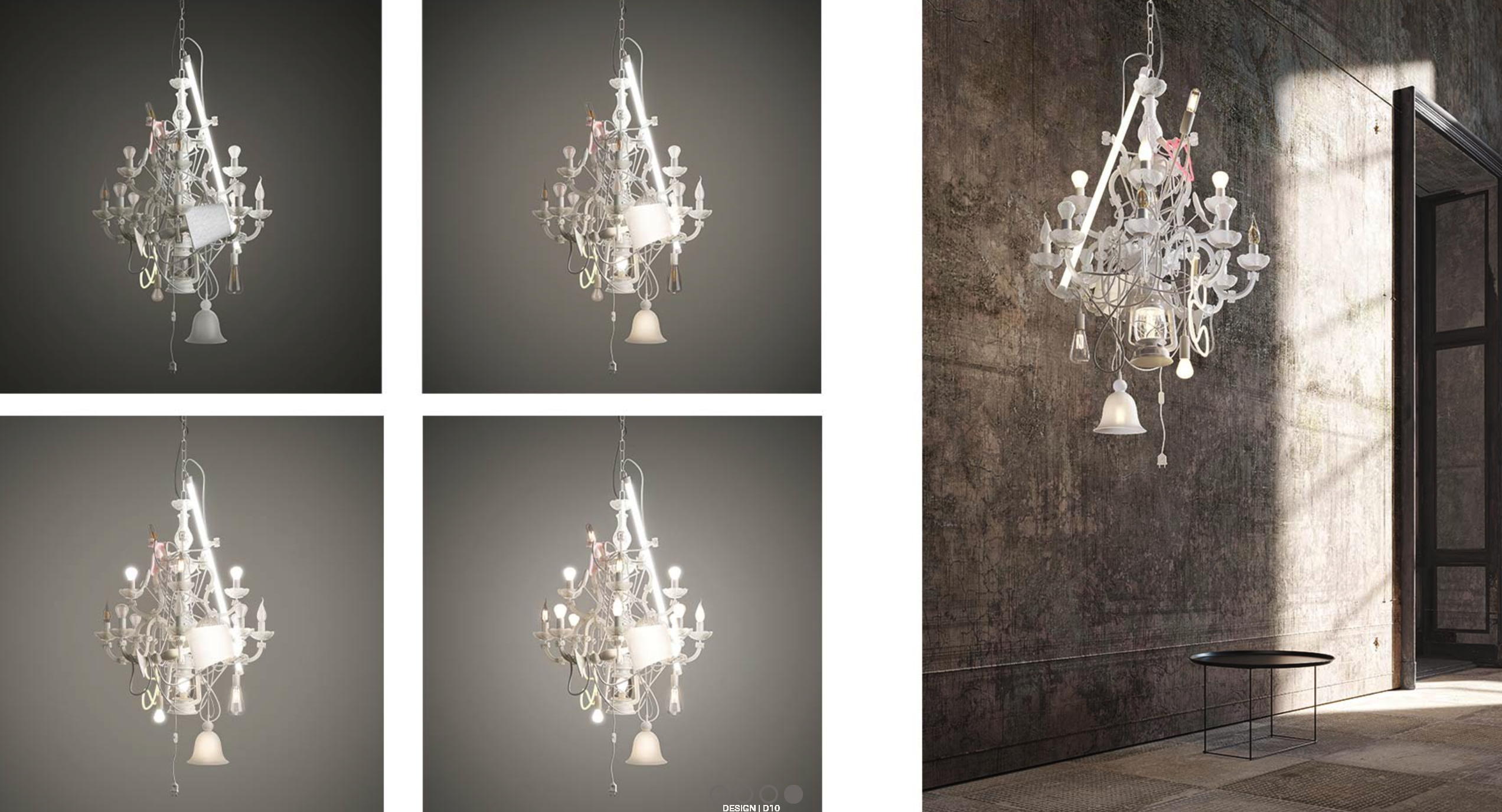 Wszystkie kanoniczne elementy są tutaj – konstrukcja nośna, ramiona, lampy i kabel – ale lekceważące podejście Marcantonio na pograniczu, gdzieś pomiędzy sztuką a designem, powołało do życia nową, zdekonstruowaną sylwetkę, stworzoną przez mieszanie kształtów, materiałów i stylów, a wszystko to najwyraźniej przynależy do obszaru semantycznego oświetlenia, choć pochodzi z różnych czasów i miejsc. Z centralnej konstrukcji z białego metalu wyłania się wiele ramion z dmuchanego szkła Murano z białym matowym wykończeniem; na stawach znajdują się rozety z kryształu z Czech, skradzione z tradycji weneckiej z połowy XVIII wieku. Jako idealne wisiorki projektantka umieściła lampę gazową, klasyczną lampkę nocną z materiałowym abażurem, szklany dzwonek, lampę na giętkim ramieniu, a nawet neonowy bar w stylu lat 80. W mieszance nie brakuje też małych „intruzów”, takich jak skacząca ryba w szkle i różowe neonowe serce, które stanowią jedyną nutę koloru.
