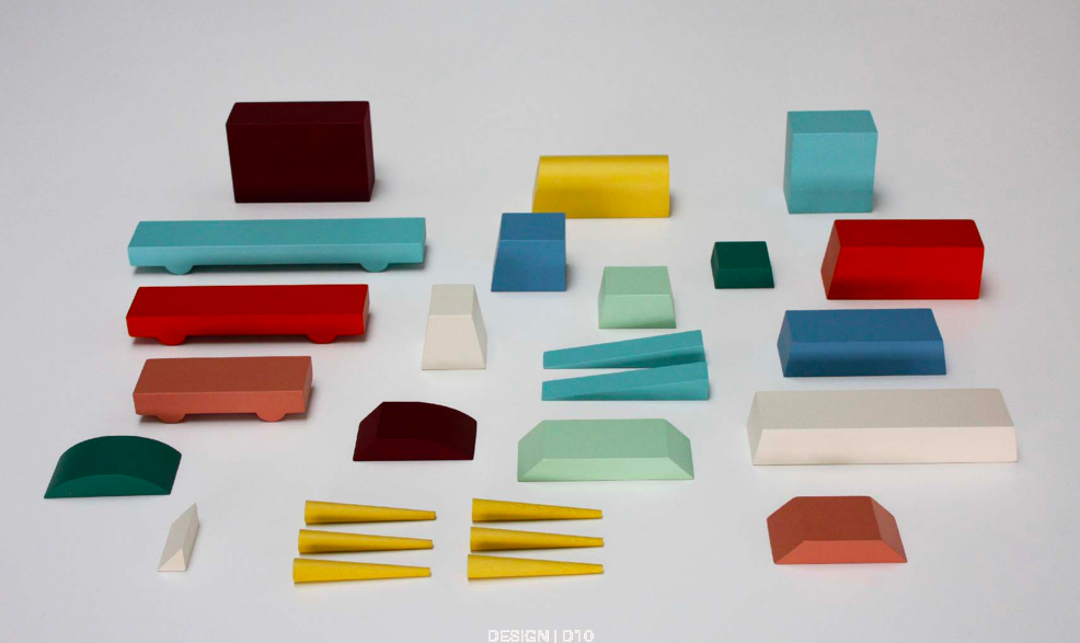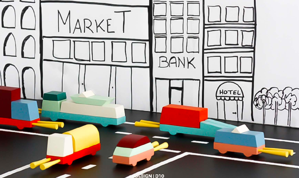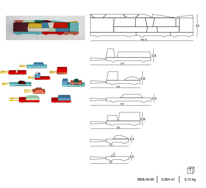Wykonane z litego drewna bukowego, złożony z elementów o różnych kształtach, kolorach i wymiarach, które można ze sobą łączyć, aby za każdym razem tworzyć inne pojazdy. Różnorakie kształty pozostawiają dużo miejsca na wyobraźnię i indywidualność.