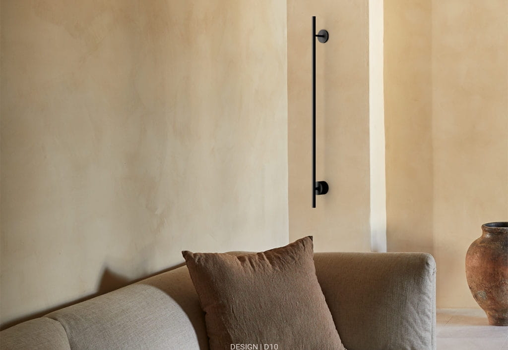Kinkiet o prostej formie przywodzącej na myśl wskazówkę zegara, wykonany w całości ze stali wykończonej matowym lakierem w kolorze czarnym.