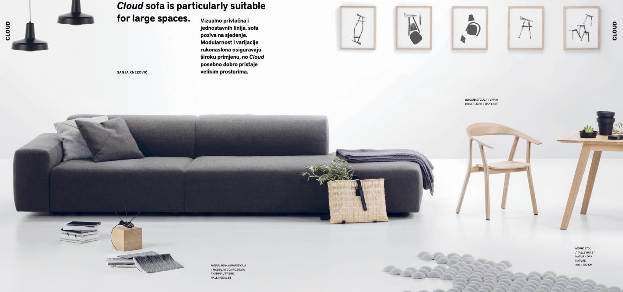 Cloud to sofa modułowa, dostępna w wielu kompozycjach. Jej budowa płynnie przechodzi z prostej linii siedziska w zagłówki i podłokietniki. Wypełnienie wewnętrznej części siedziska pianką o wysokiej sprężystości i wierzchniej warstwy pokrywą z piór daje poczucie siedzenia w chmurach. To powoduje, że mamy zapewniony relaks i komfort na najwyższym poziomie. Dzięki temu, że sofa jest w opcji modułowej można ją idealnie dopasować do różnych powierzchni, wybierając szezlong po prawej lub lewej stronie. Obicia wymienne, dostępne w wielu kolorach tkanin i skór.