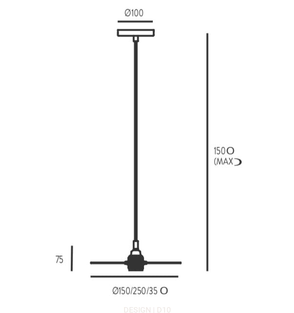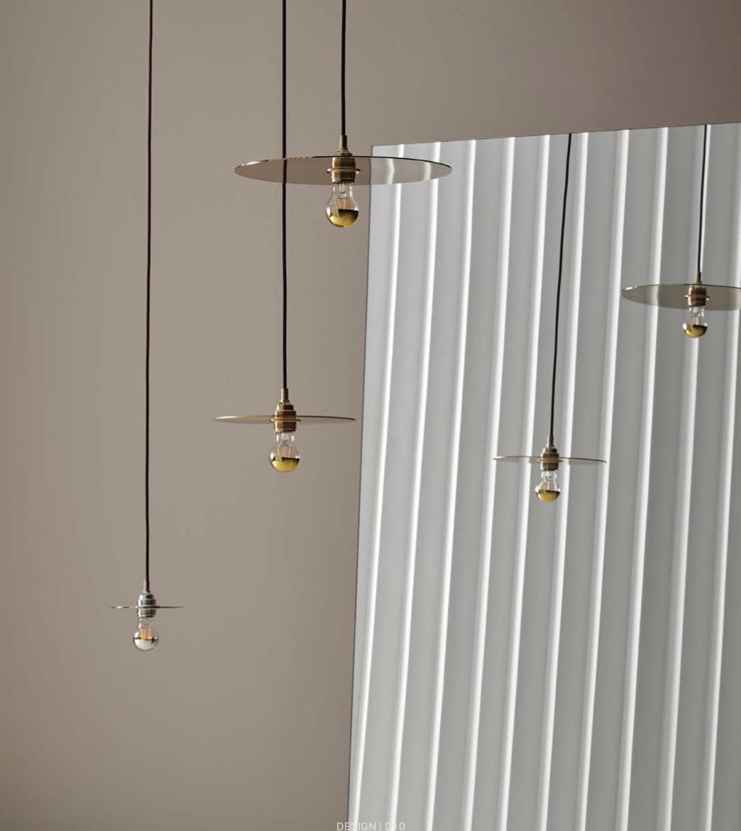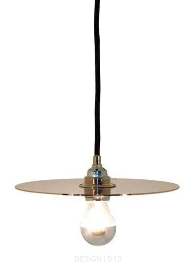 Metalowa lampa wisząca z kloszem w kształcie poziomego dysku o średnicy 15 cm, zawieszonym na cienkim kablu. Dostępna jest w kolorach czarnym, białym, złotym, oraz chromowanym.