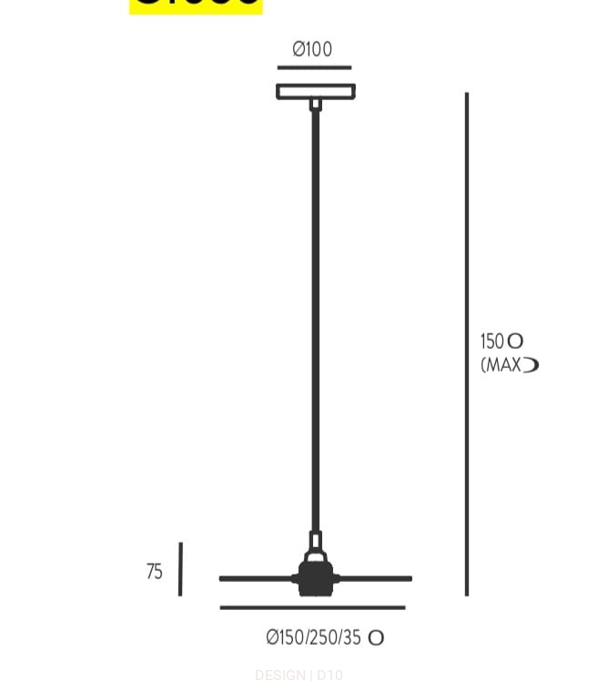 Metalowa lampa wisząca z kloszem w kształcie poziomego dysku o średnicy 35 cm, zawieszonym na cienkim kablu. Dostępna jest w kolorach czarnym, białym, złotym, oraz chromowanym.