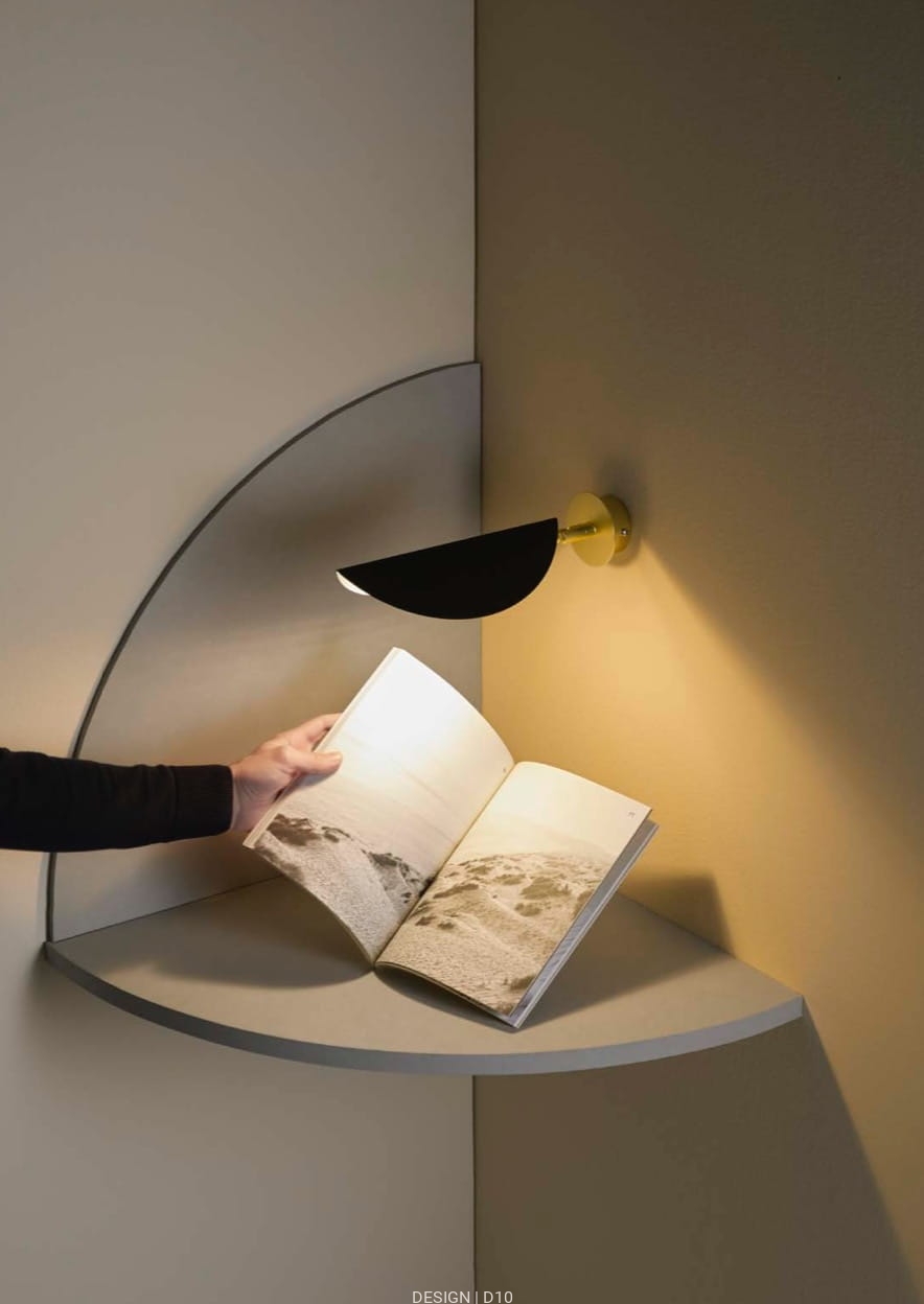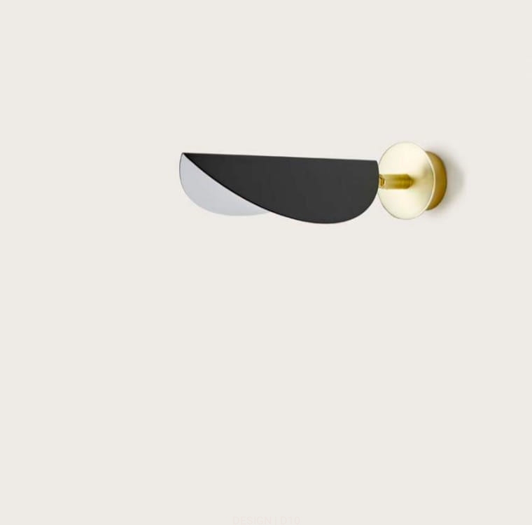 Lampa ścienna na wysmukłej nóżce z kloszem w kształcie liścia figowca. Nowoczesna i elegancka, w całości wykonana z metalu, wykończona w kolorze matowego mosiądzu, klosz w kolorze matowej czerni.