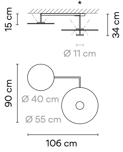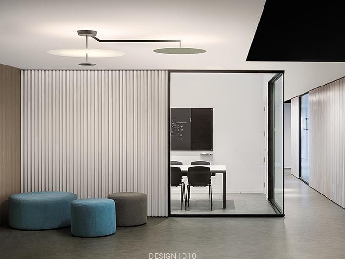 Lampy FLAT ze źródłami LED wykonane są z metalowych dysków umieszczonych na różnych wysokościach. Powierzchnie tych płaszczyzn odbijają światło, emitując otaczającą luminancję, która wydaje się pochodzić z jego wnętrza. Delikatna, ale uderzająca grafika, światło, które wydaje się unosić nad głową.