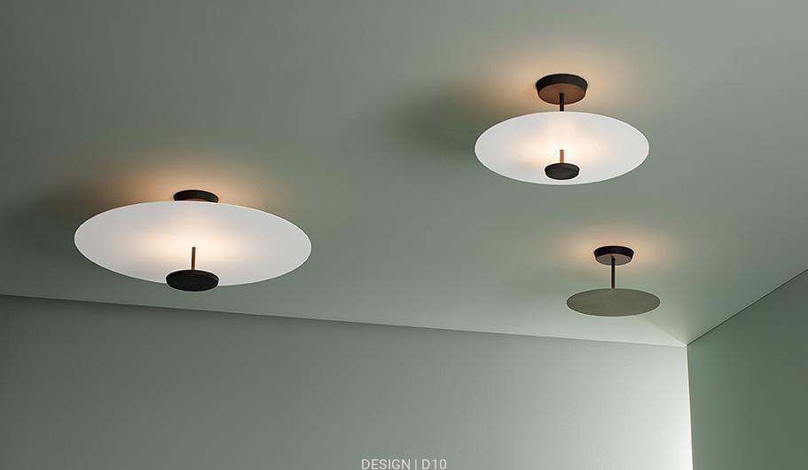 Lampy FLAT ze źródłami LED wykonane są z metalowych dysków umieszczonych na różnych wysokościach. Powierzchnie tych płaszczyzn odbijają światło, emitując otaczającą luminancję, która wydaje się pochodzić z jego wnętrza. Delikatna, ale uderzająca grafika, światło, które wydaje się unosić nad głową.