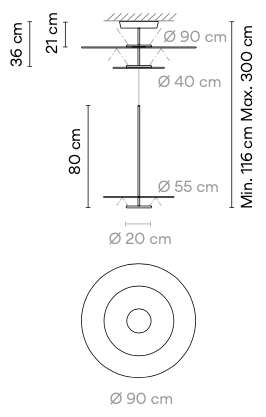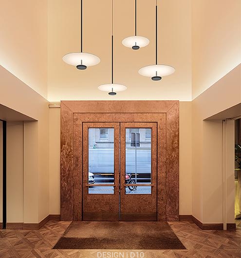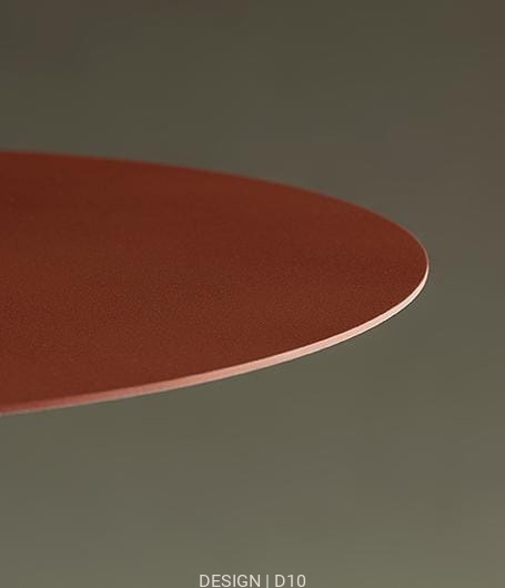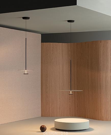Lampy FLAT ze źródłami LED wykonane są z metalowych dysków umieszczonych na różnych wysokościach. Powierzchnie tych płaszczyzn odbijają światło, emitując otaczającą luminancję, która wydaje się pochodzić z jego wnętrza. Delikatna, ale uderzająca grafika, światło, które wydaje się unosić nad głową.