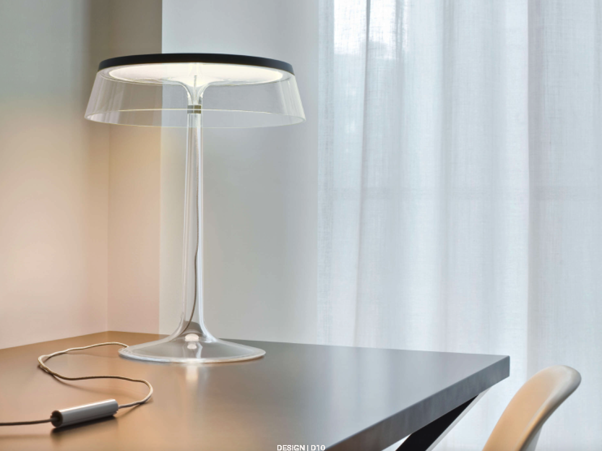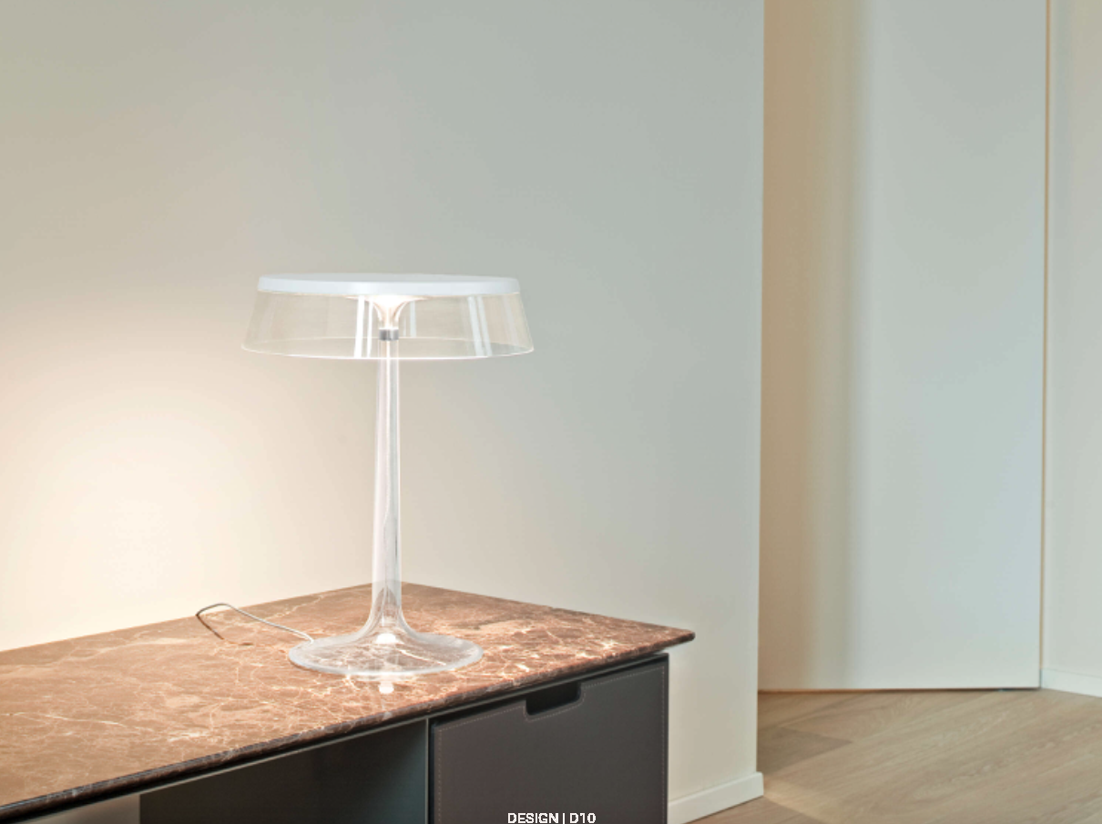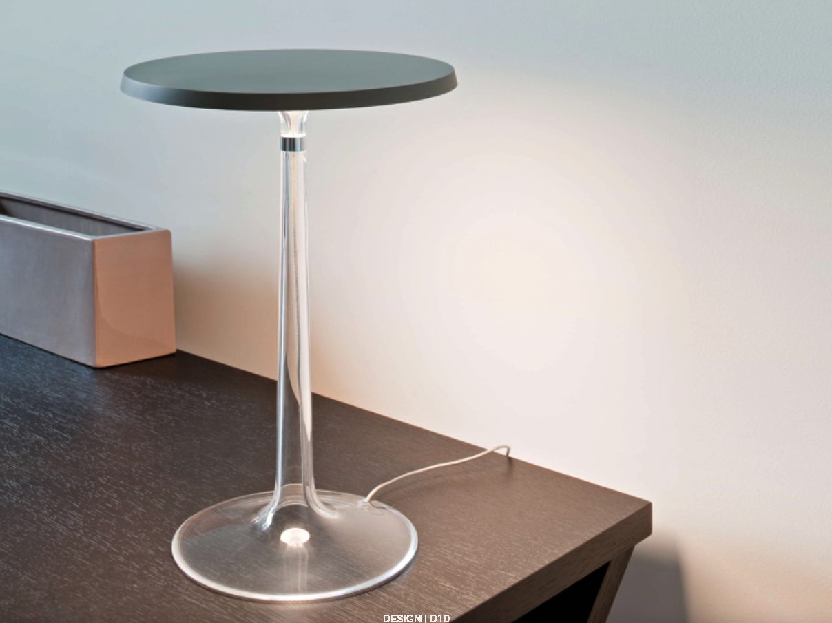 Bon Jour od Flos to elegancka lampa stołowa autorstwa Philippe’a Starcka, która łączy nowoczesną technologię z klasyczną sylwetką. Jej przezroczysta podstawa i metalowy trzon kontrastują z wymiennym abażurem, dając możliwość personalizacji i dopasowania do różnych stylów wnętrz.