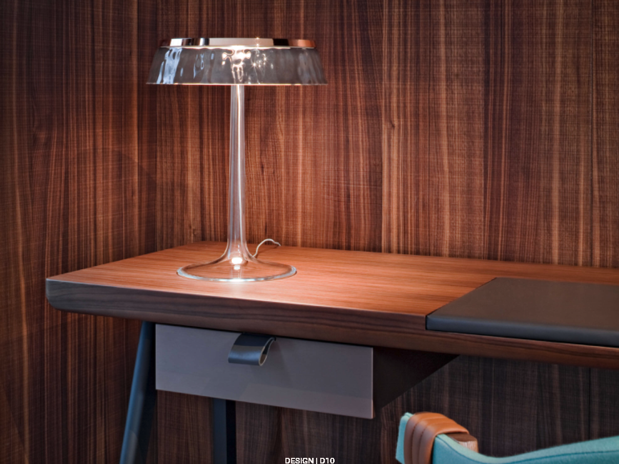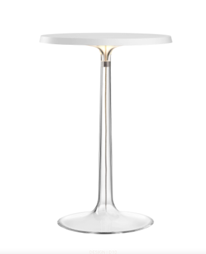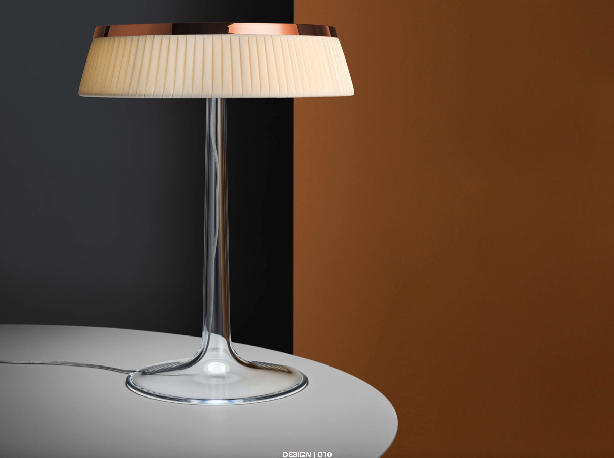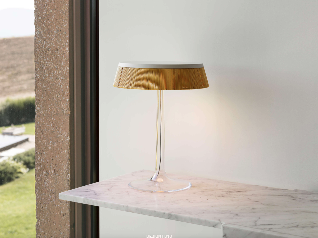 Bon Jour od Flos to elegancka lampa stołowa autorstwa Philippe’a Starcka, która łączy nowoczesną technologię z klasyczną sylwetką. Jej przezroczysta podstawa i metalowy trzon kontrastują z wymiennym abażurem, dając możliwość personalizacji i dopasowania do różnych stylów wnętrz.