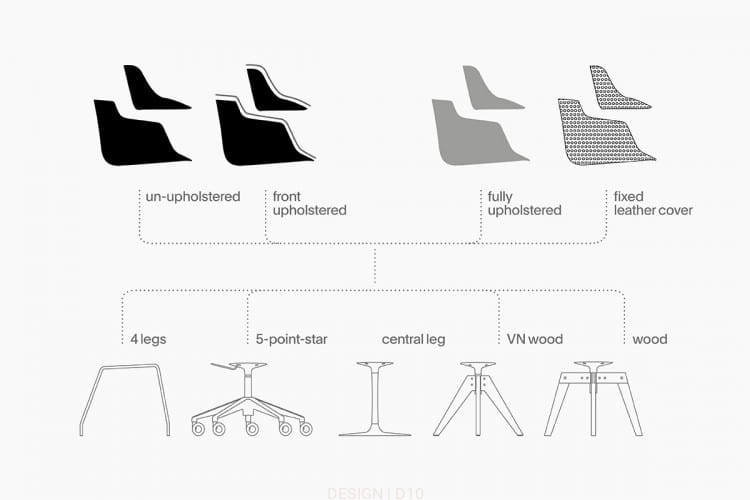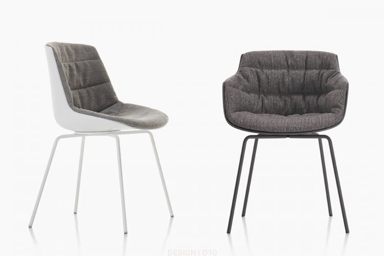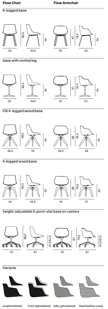 Dzięki ponad 21 000 dostępnych konfiguracji, Flow oferuje rozwiązania dostosowane do różnych stylów i potrzeb. Matowe wykończenie siedziska występuje w szerokiej gamie kolorów, zgodnej z aktualnymi trendami, w tym białym, szaro-ołowianym, terakotowym oraz biało-szarym. Różnorodność baz – od klasycznych czterech nóg ze stali, przez pięcioramienne podstawy gwiaździste, aż po drewniane warianty – umożliwia pełną personalizację. Siedzisko dostępne jest w wersji bez tapicerki, z tapicerowaną frontową częścią, całkowicie tapicerowane lub wykończone skórą.