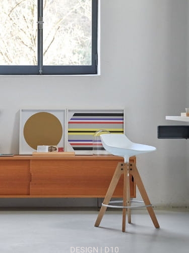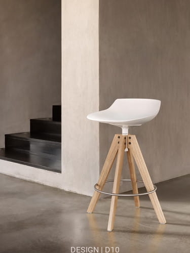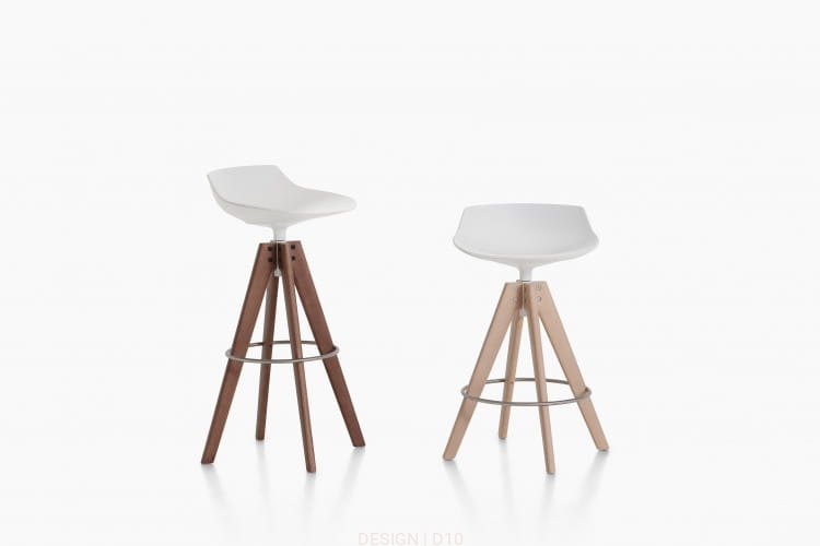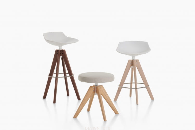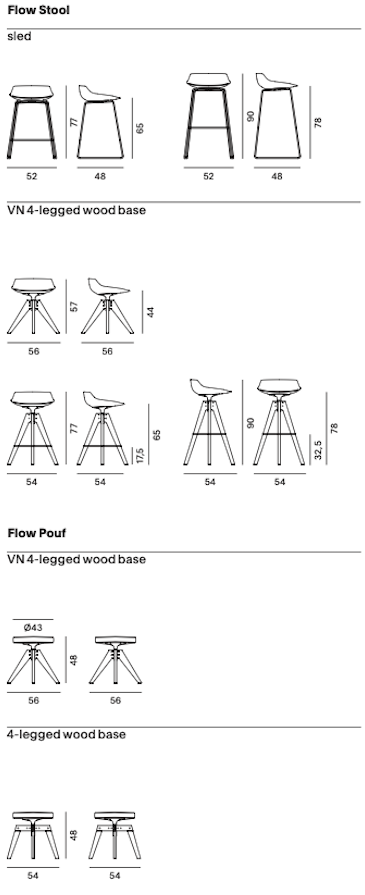 Flow Stool dostępny jest w kilku wersjach podstaw: na płozach, czterech drewnianych nogach oraz na czterech nogach VN, wykonanych z drewna w wykończeniach naturalnym, brązowym, wybielonym lub w nowej wersji z orzecha canaletto. Dla zwiększenia komfortu, dostępna jest również opcjonalna tapicerowana poduszka.