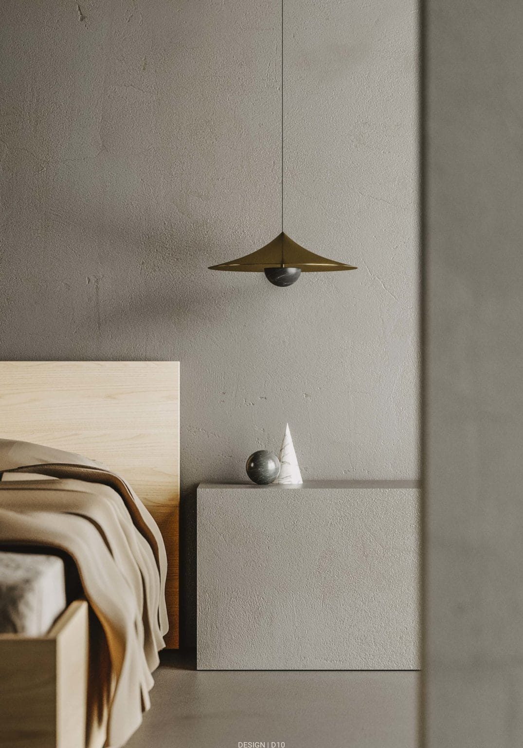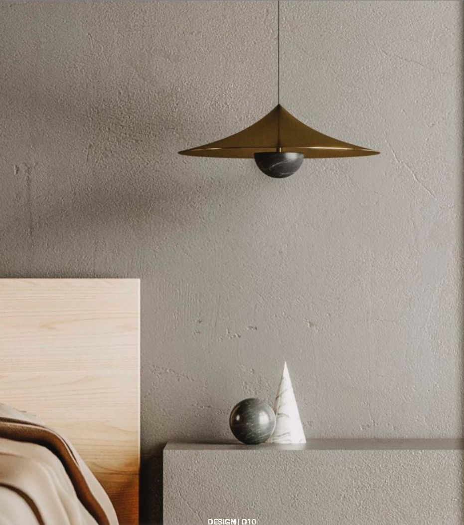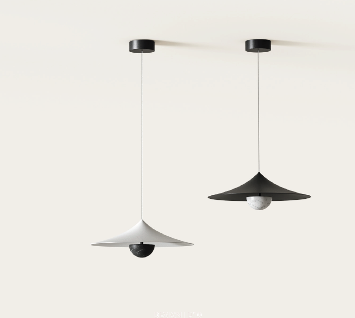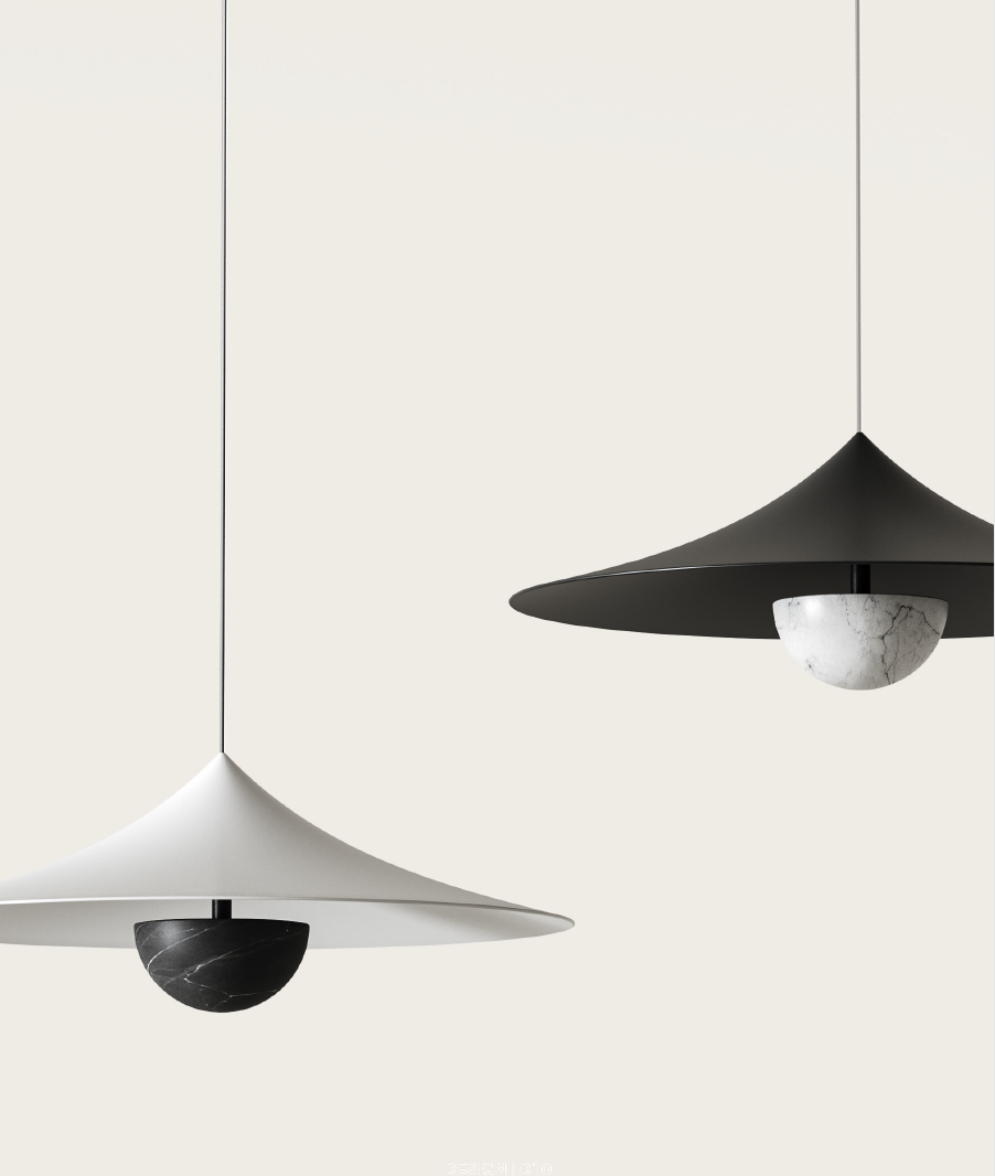 Lampa wisząca inspirowana kształtem japońskiego kapelusza. Ozdobny klosz wykony ze stali malowanej w kolorze starego złota, czarnym lub białym; dekoracyjna półkolista osłona z białego lub czarnego marmuru.