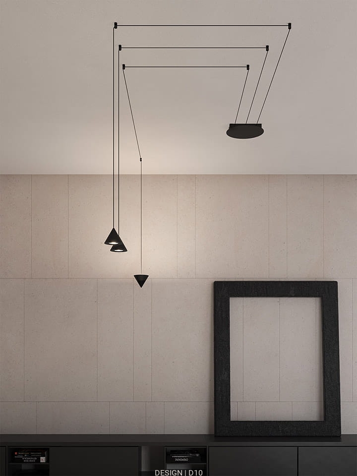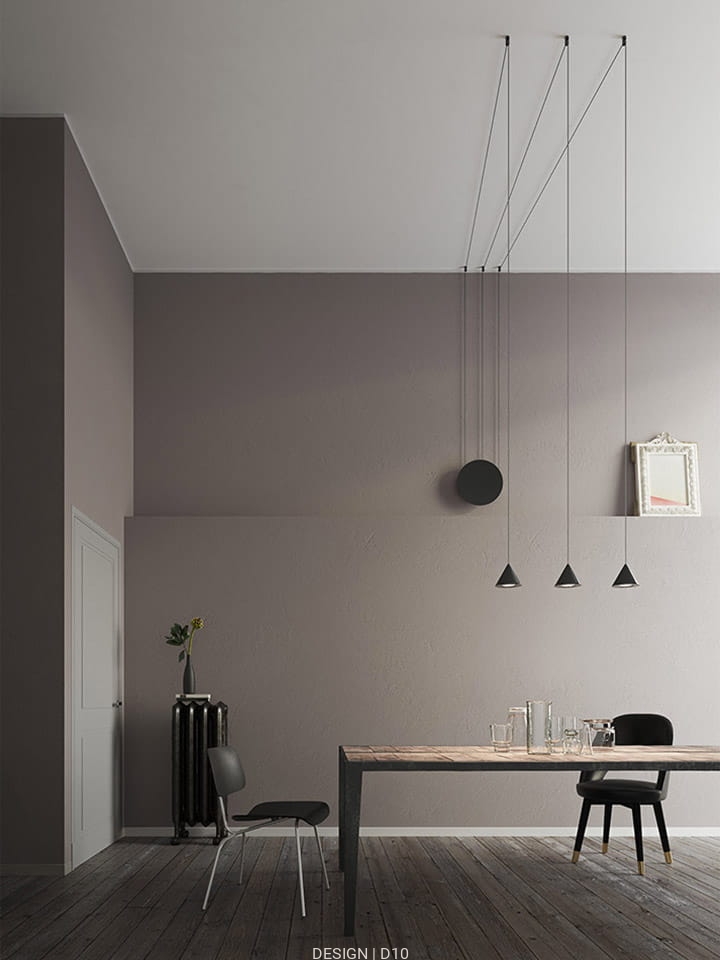Lampa wisząca Filomena włoskiej firmy Karman bazuje prostym czarny aluminiowym stożku.