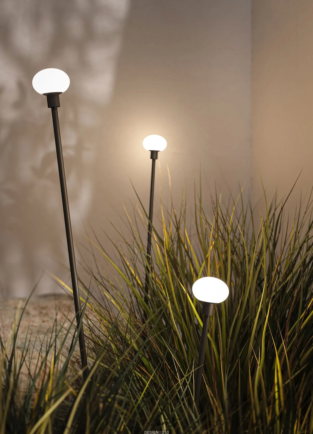 Minuit przywołuje na myśl pole smukłych, wydłużonych łodyg, zakończonych delikatnymi świetlistymi punktami przypominającymi małe zawieszone kule. Zainspirowana naturalną prostotą polnych kwiatów, zapewnia miękkie, rozproszone światło, idealne do tworzenia czarującej atmosfery w ogrodach, na dziedzińcach lub tarasach.