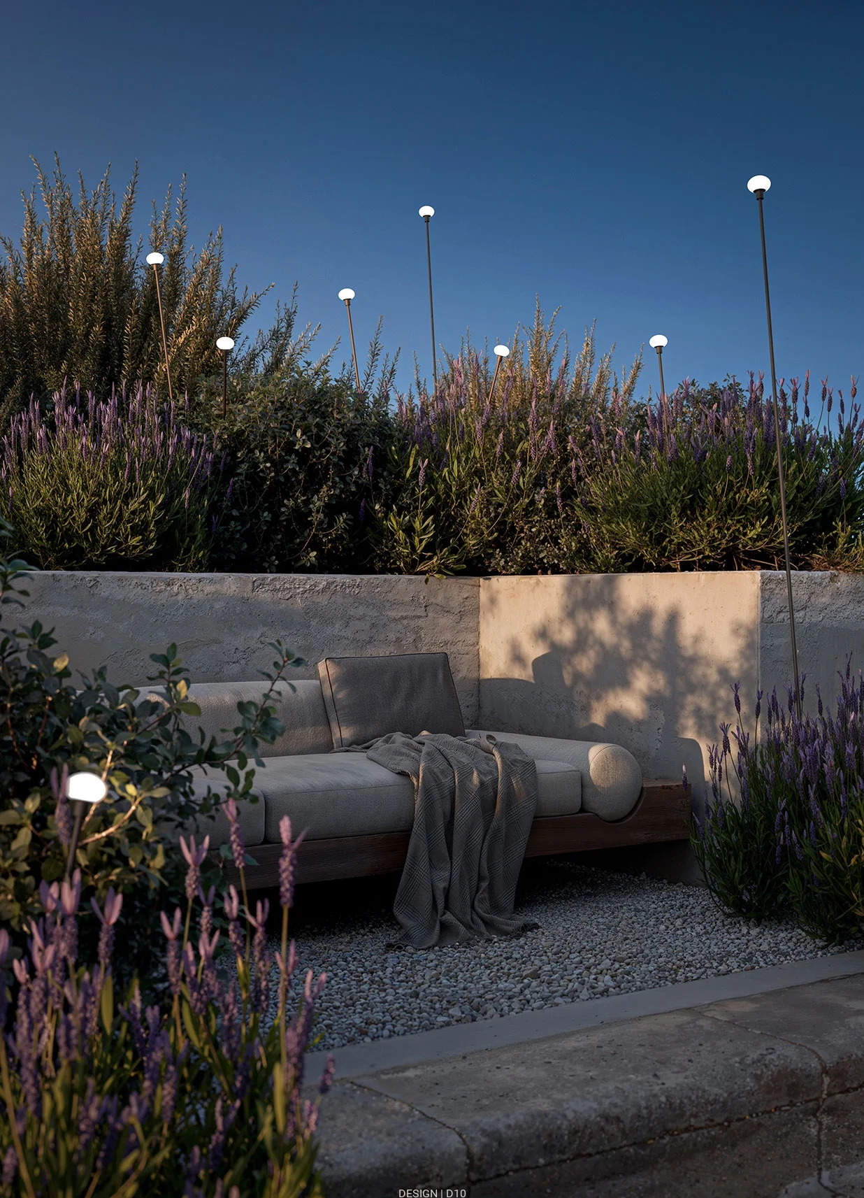 Minuit przywołuje na myśl pole smukłych, wydłużonych łodyg, zakończonych delikatnymi świetlistymi punktami przypominającymi małe zawieszone kule. Zainspirowana naturalną prostotą polnych kwiatów, zapewnia miękkie, rozproszone światło, idealne do tworzenia czarującej atmosfery w ogrodach, na dziedzińcach lub tarasach.