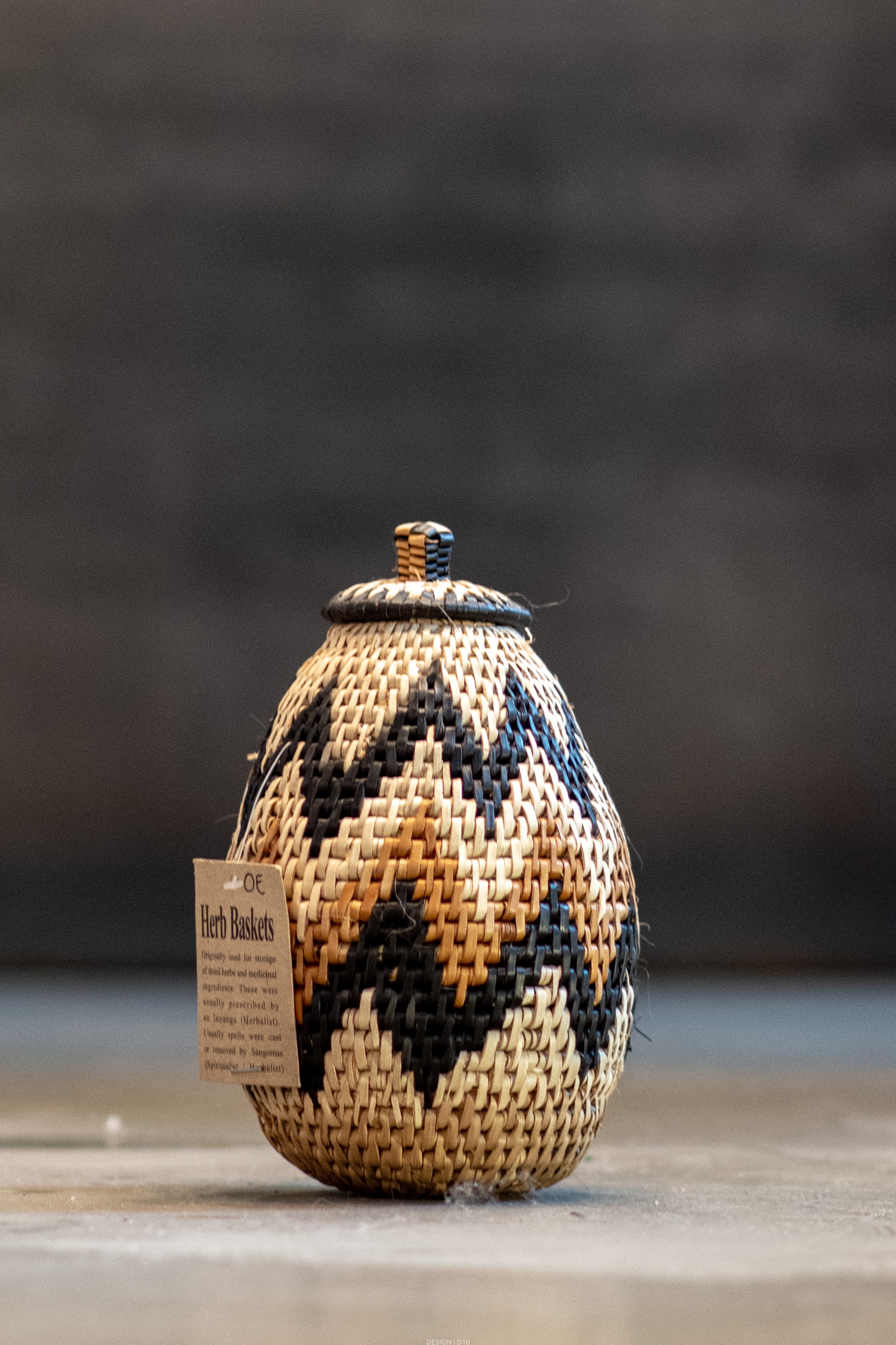 Wykonanie: zwinięte kępy trawy, związane i zszyte ręcznie przy pomocy siekanych liści palmy Ilala z użyciem naturalnych barwników