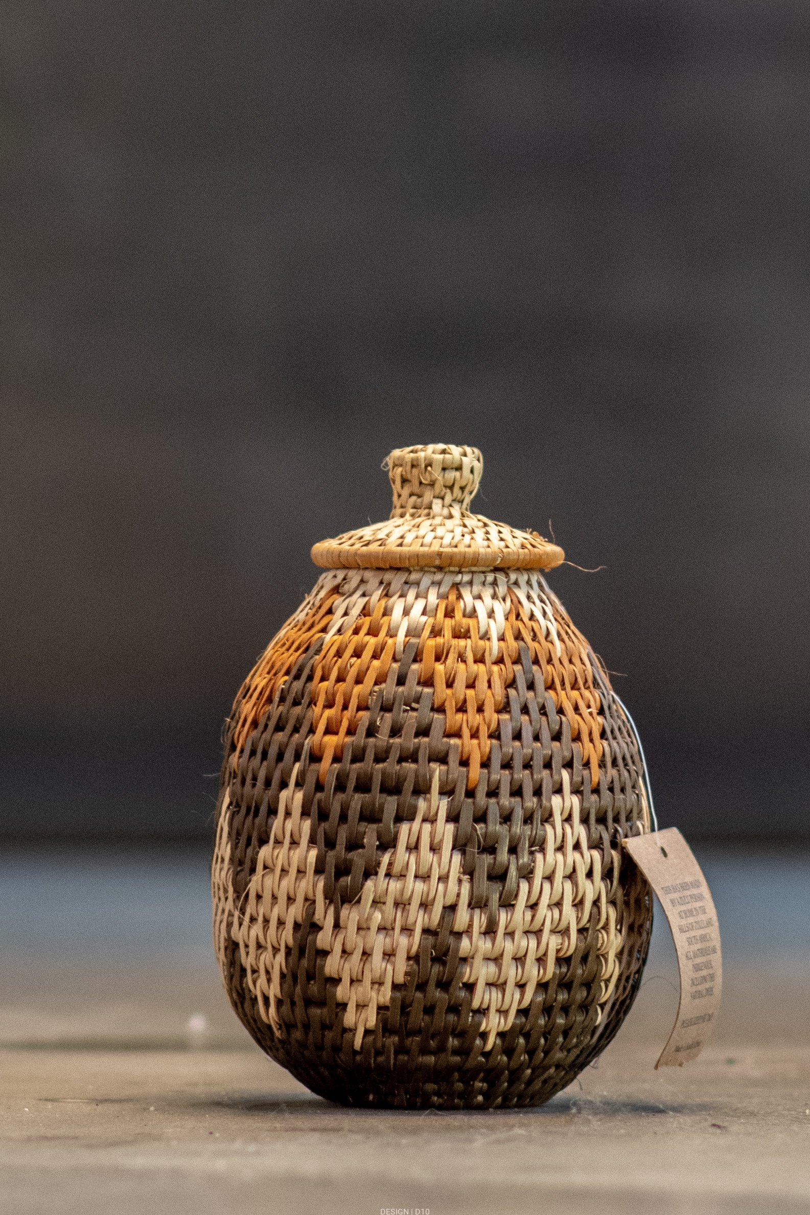 Wykonanie: zwinięte kępy trawy, związane i zszyte ręcznie przy pomocy siekanych liści palmy Ilala z użyciem naturalnych barwników