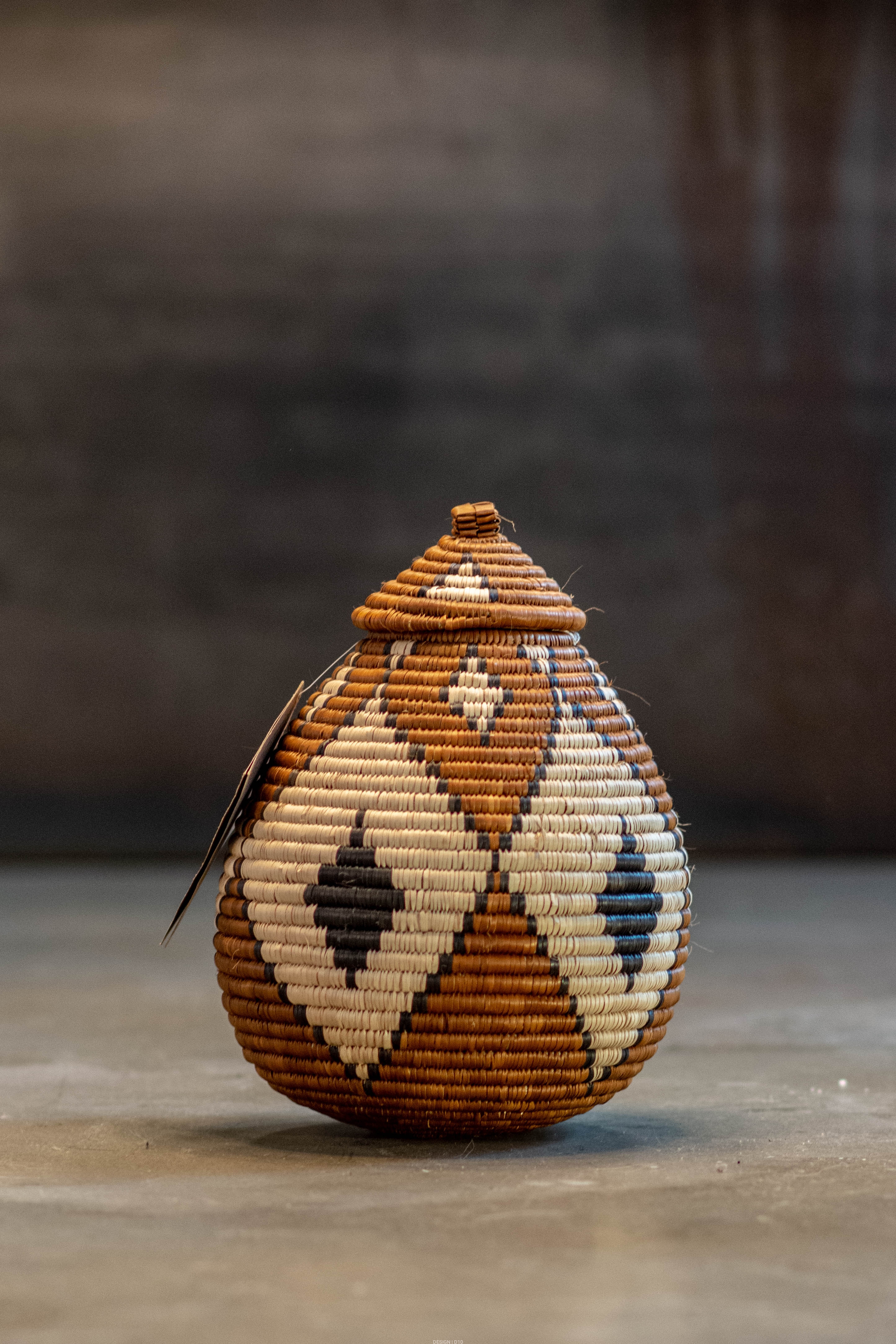 Wykonanie: zwinięte kępy trawy, związane i zszyte ręcznie przy pomocy siekanych liści palmy Ilala z użyciem naturalnych barwników