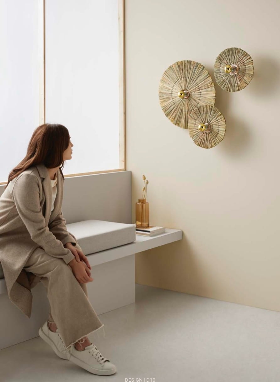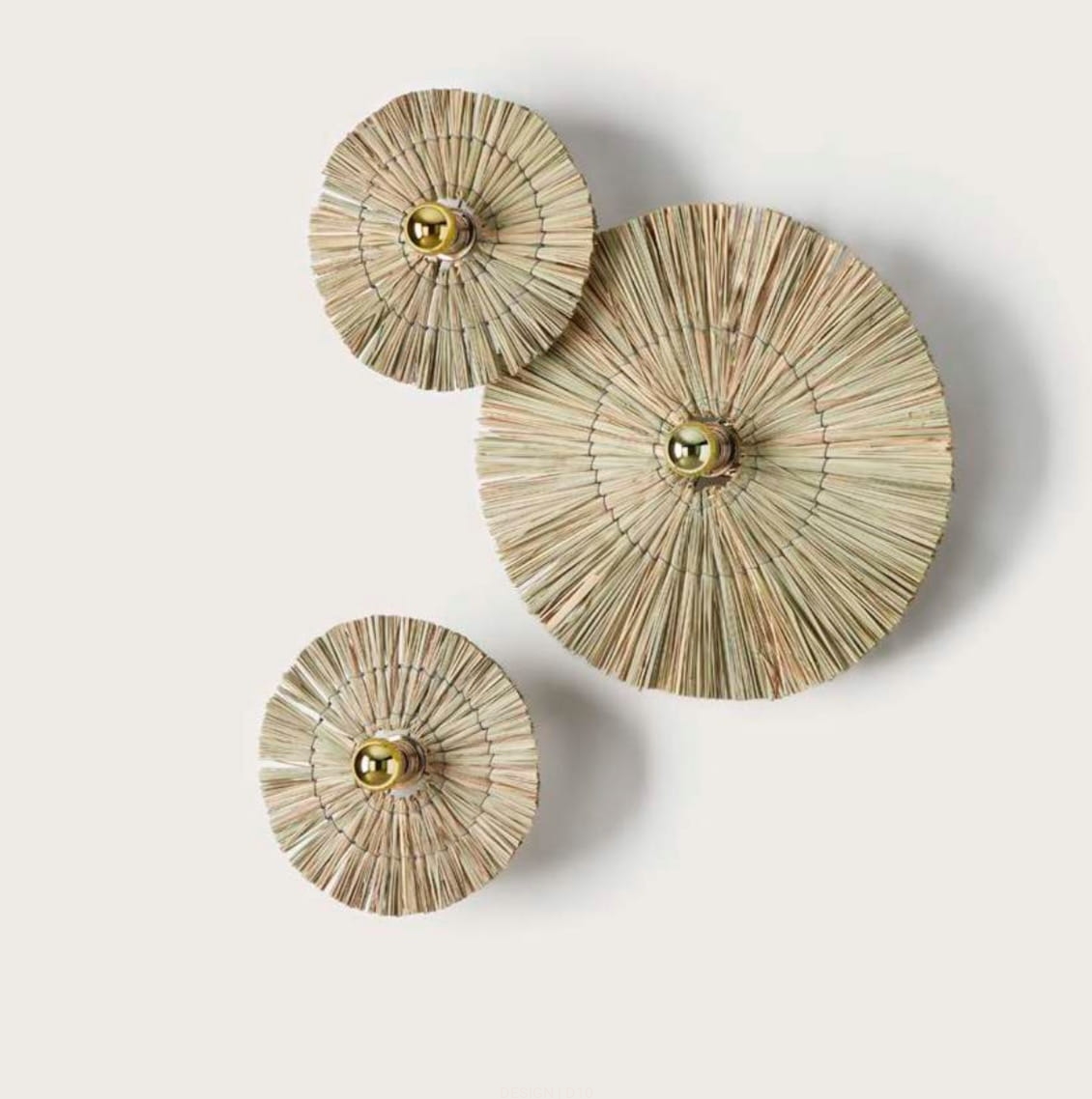 Prosty metalowy kinkiet z plecionym kloszem w kształcie dysku. Dostępne kolory podstawy to: złoto, chrom, biały oraz czerń, które zawsze są w towarzystwie plecionego dysku. Dysk występuje w dwóch rozmiarach 30 i 50 cm.