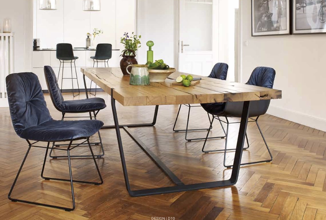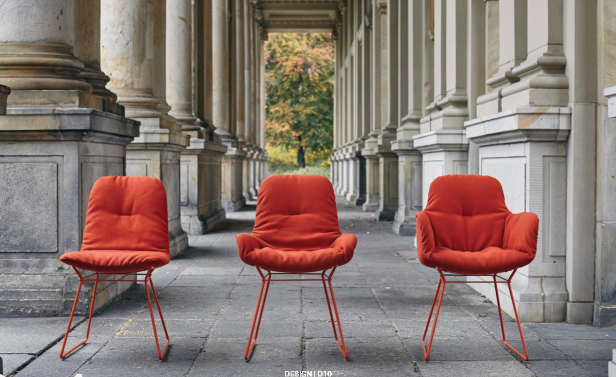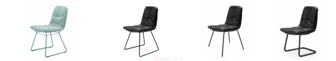 Krzesło z bogatej kolekcji Leya, obejmującej wiele krzeseł, foteli, hokerów i ławek. Siedzisko tapicerowane jest w całości – do wyboru są najwyższej jakości tkaniny naturalne, sztuczne i syntetyczne, a także wysokogatunkowe skóry. Obicie może być jednorodne lub wykonane z dwóch różnych materiałów. Do wyboru jest także wiele wersji podstawy ze stali malowanej proszkowo (płozy lub nóżki z prętów, wersja obrotowa z regulowaną wysokością, na kółkach) lub z litego drewna barwionego w różnych kolorach.