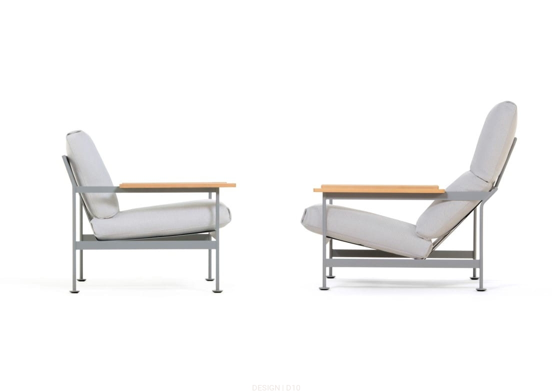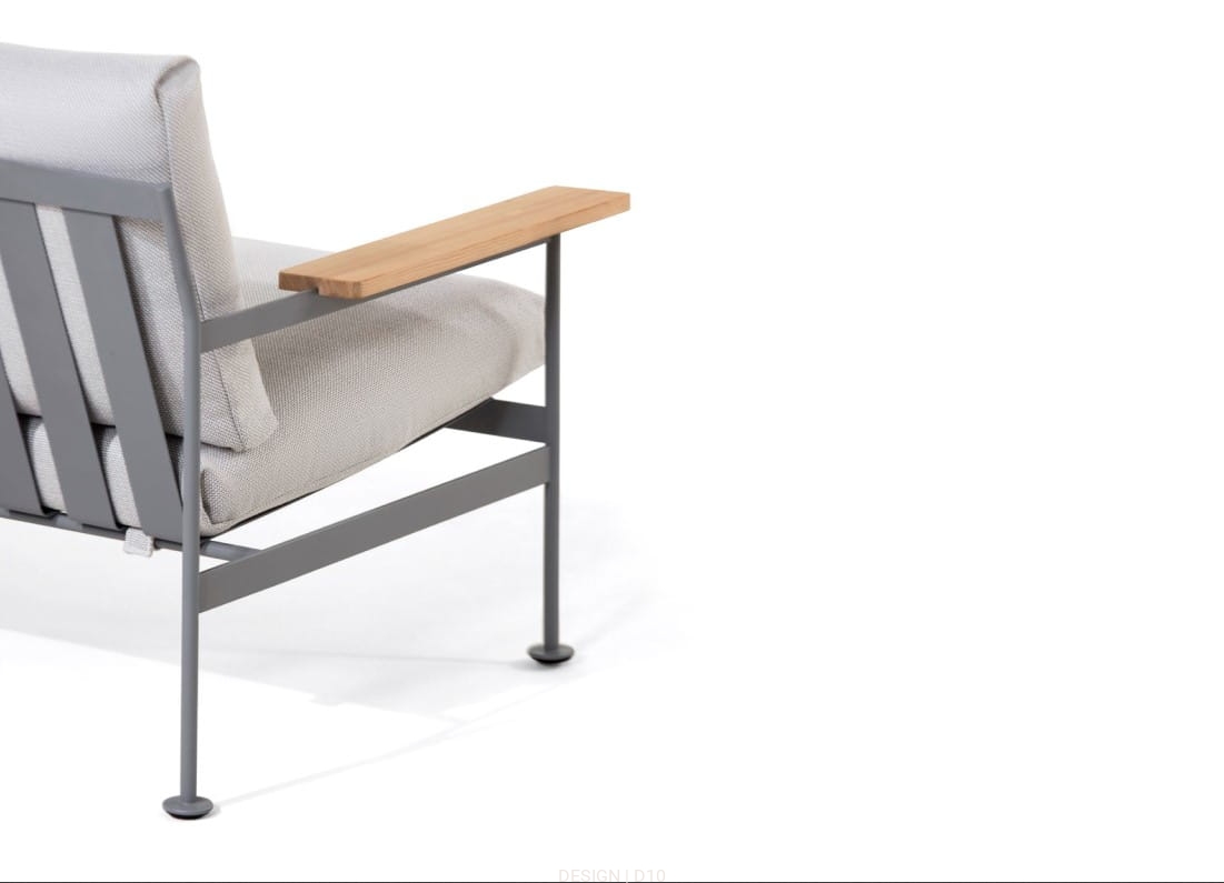 ze stali nierdzewnej z dużymi drewnianymi podłokietnikami i bogatymi poduszkami. Siedzisko i oparcie są nachylone pod kątem, co zapewnia ergonomię na wysokim poziomie w pozycji siedzącej. Podłokietniki z litego drewna zarówno fotela,