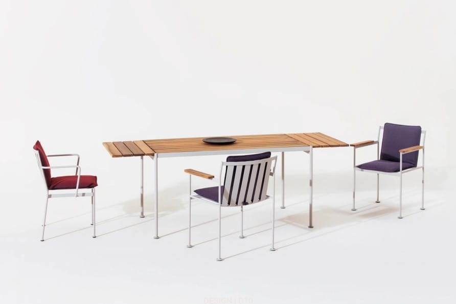 jak i leżaka Jugo są charakterystycznie szerokie. Ich szerokość niemal odpowiada wymiarom stolików z tacami, na których można odstawić szklankę z ulubionym napojem. Ta funkcja nadaje fotelowi bardzo specyficzną, relaksującą i wystawną cechę. Wszystkie powierzchnie stołów i stolików niskich wykonane są z łupków drewnianych i metalowych, wyselekcjonowanych jako trwałe materiały,