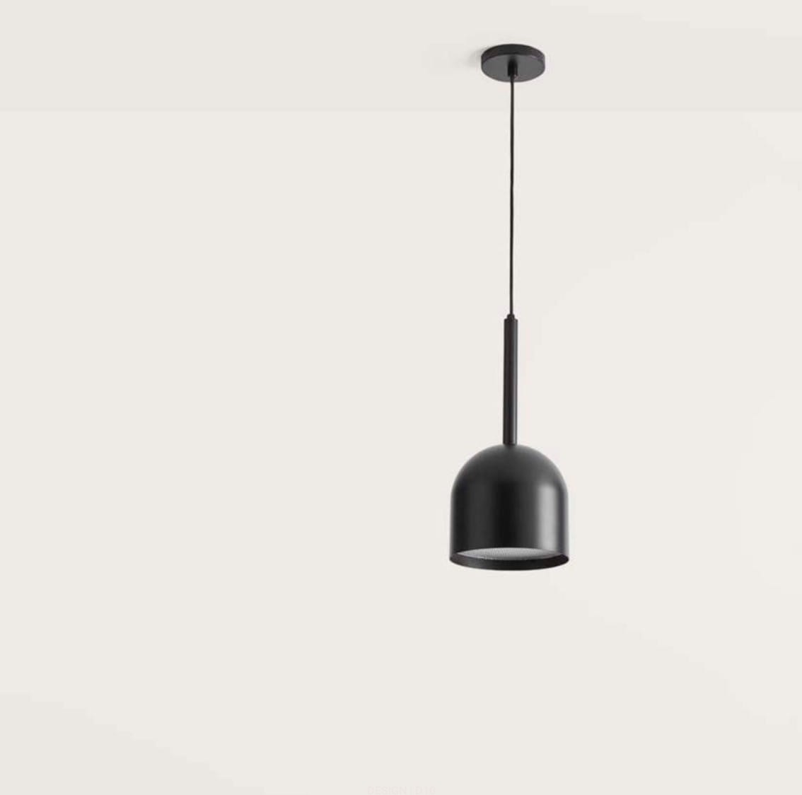 Metalowa minimalistyczna lampa wykończona w kolorze czarny mat. Składająca się z prostego owalnego klosza zawieszonego na cienkiej rurce wychodzącej z czarnej podstawy.