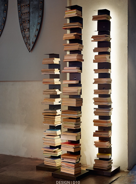 Podobnie jak wersja oryginalna, Ptolomeo Luce składa się z lakierowanej metalowej kolumny, spoczywającej na solidnej podstawie, również wykonanej z metalu, zaprojektowanej tak, aby zapewnić równowagę całej konstrukcji. Książki umieszcza się na małych, nakładających się półkach, które znikają, gdy kolumna zapełnia się książkami. Ptolomeo Luce, dzięki systemowi podświetlenia tylnego, wzmacnia niesamowity efekt, jaki daje wrażenie stania przed stabilnym stosem książek, zdolnym do pokonania wysokości bez potrzeby stosowania jakiegokolwiek podparcia. Dostępna w trzech wysokościach, dzięki minimalistycznemu i esencjalnemu wzornictwu idealnie pasuje do każdego rodzaju klasycznego lub współczesnego wystroju wnętrza; w sypialni, w rogu salonu lub w gabinecie, a oprócz tego, że jest prawdziwym meblem, może również służyć jako lampa do czytania.