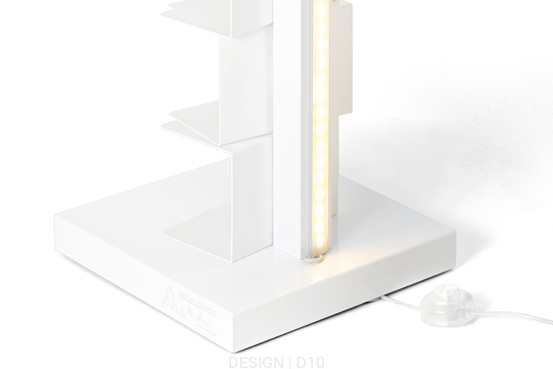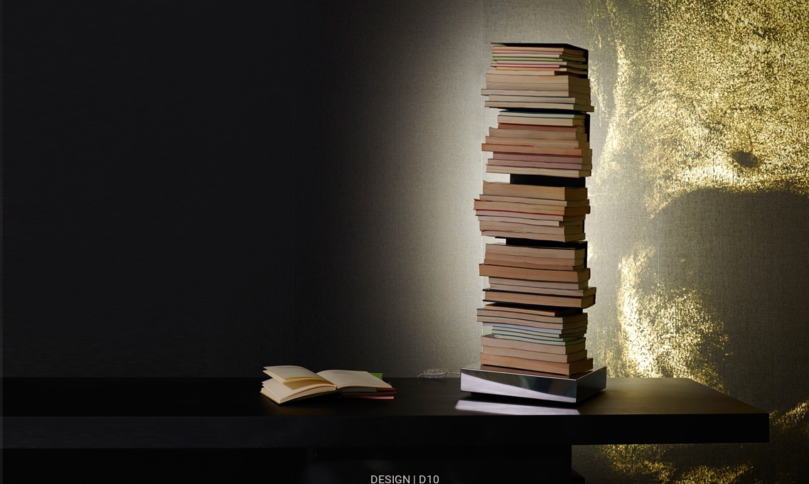 Podobnie jak wersja oryginalna, Ptolomeo Luce składa się z lakierowanej metalowej kolumny, spoczywającej na solidnej podstawie, również wykonanej z metalu, zaprojektowanej tak, aby zapewnić równowagę całej konstrukcji. Książki umieszcza się na małych, nakładających się półkach, które znikają, gdy kolumna zapełnia się książkami. Ptolomeo Luce, dzięki systemowi podświetlenia tylnego, wzmacnia niesamowity efekt, jaki daje wrażenie stania przed stabilnym stosem książek, zdolnym do pokonania wysokości bez potrzeby stosowania jakiegokolwiek podparcia. Dostępna w trzech wysokościach, dzięki minimalistycznemu i esencjalnemu wzornictwu idealnie pasuje do każdego rodzaju klasycznego lub współczesnego wystroju wnętrza; w sypialni, w rogu salonu lub w gabinecie, a oprócz tego, że jest prawdziwym meblem, może również służyć jako lampa do czytania.