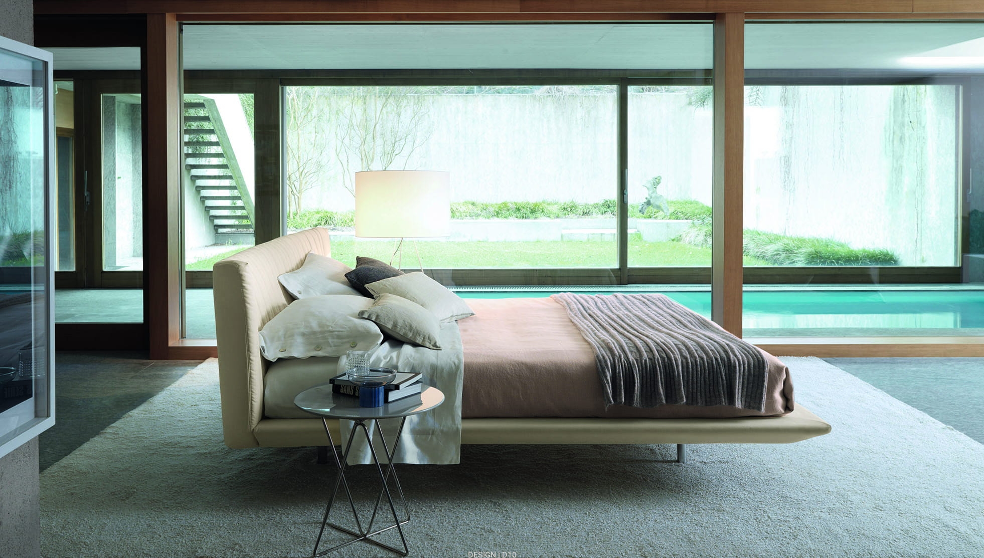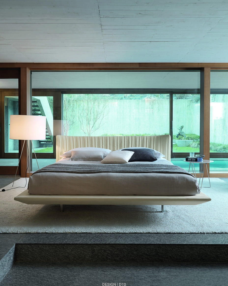 Shellon to łóżko o miękkim i zaokrąglonym zagłówku z delikatna, pikowaną tapicerką. Dostępne tapicerowanie z tkaniny lub skóry. Nóżki wykonane z polerowanego aluminium.