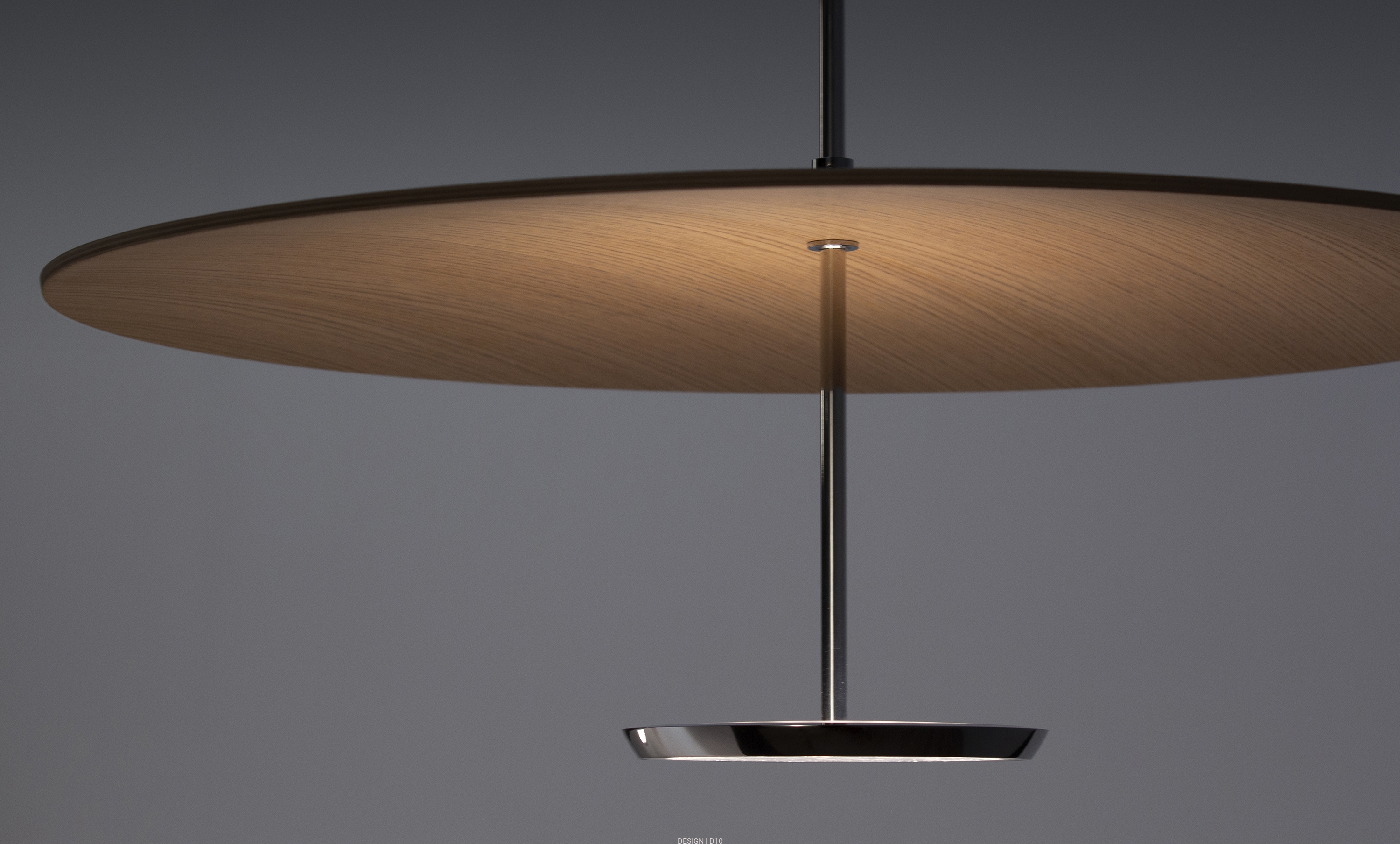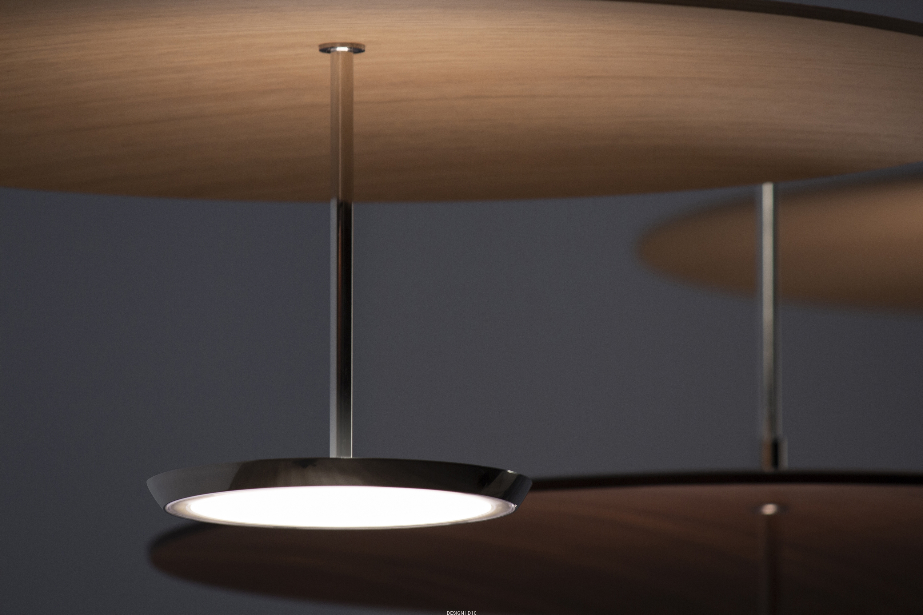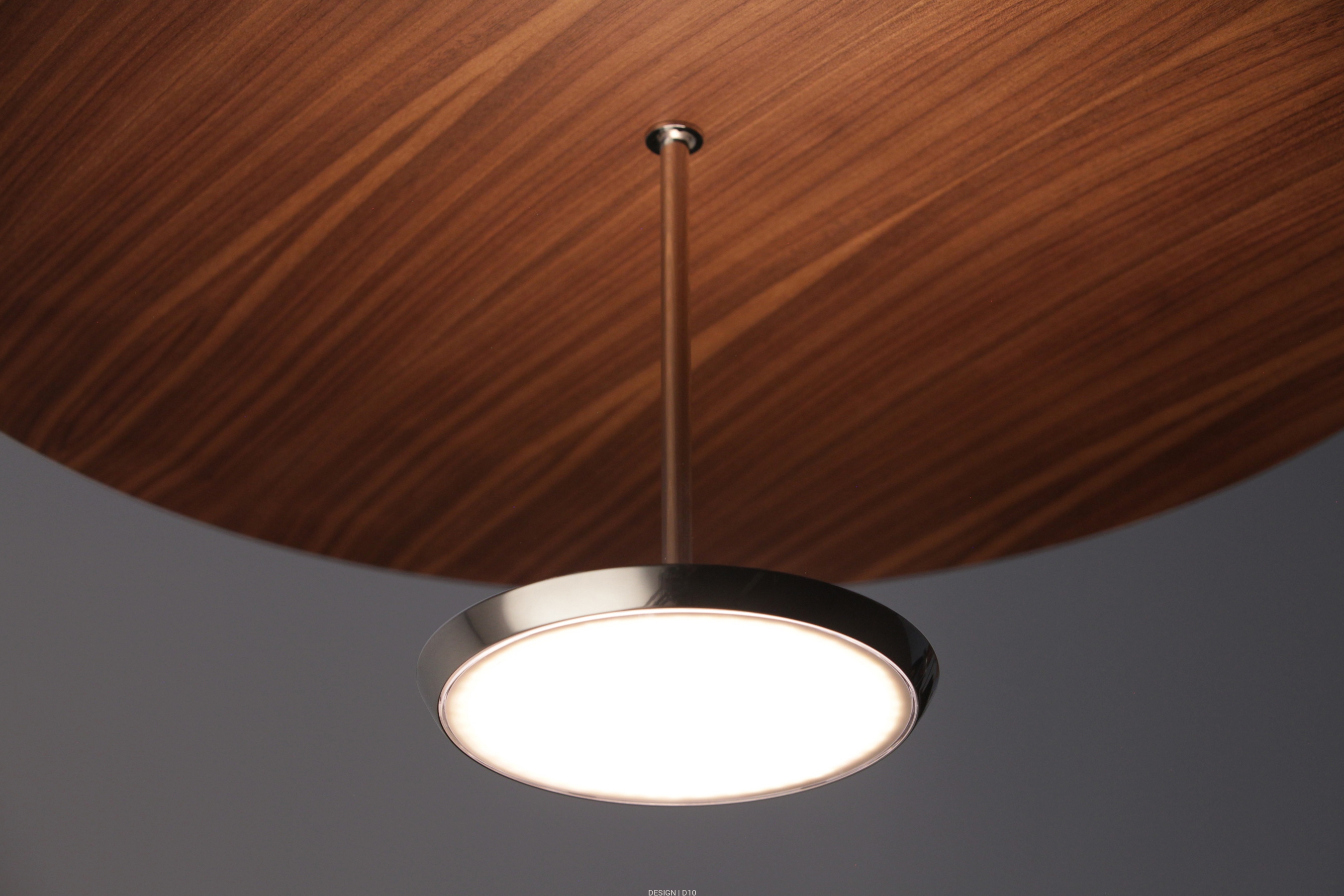 Wykonanie: Konstrukcja z aluminium polerowanego lub malowanego na czarny matowy, dysk z metalu o kolorze matowy czarny / matowy biały / matowy mosiądz lub z drewna orzechowego / białego dębu