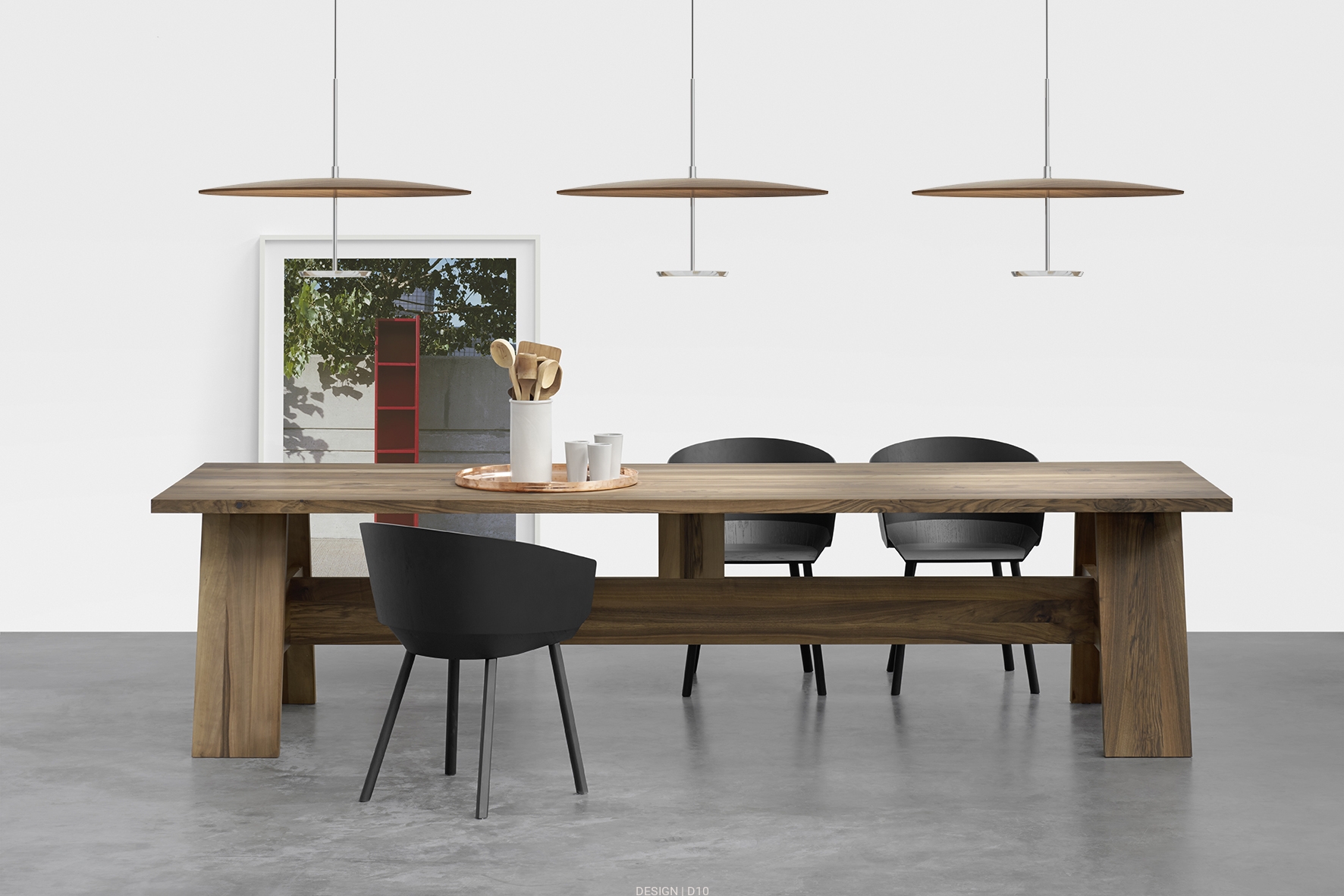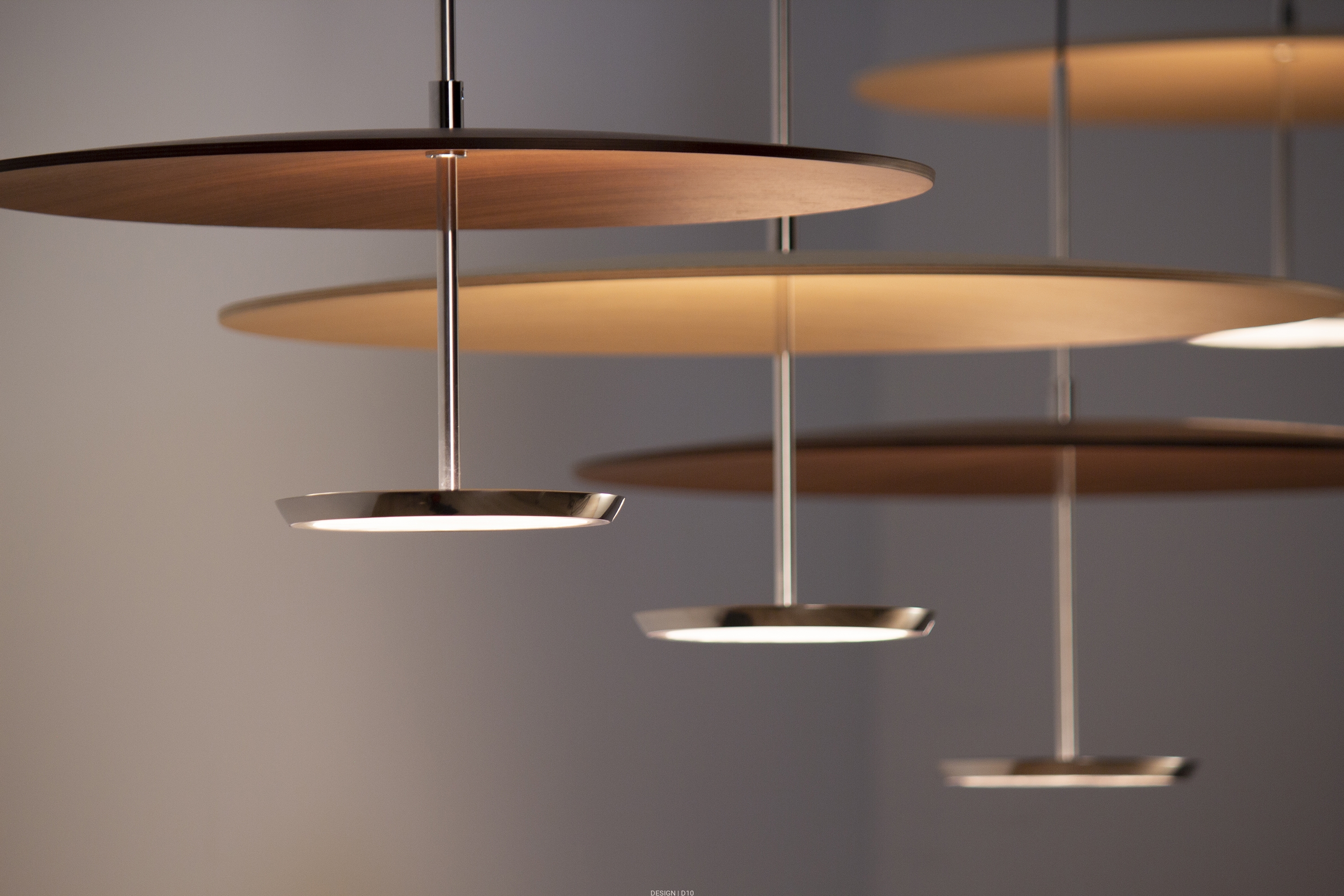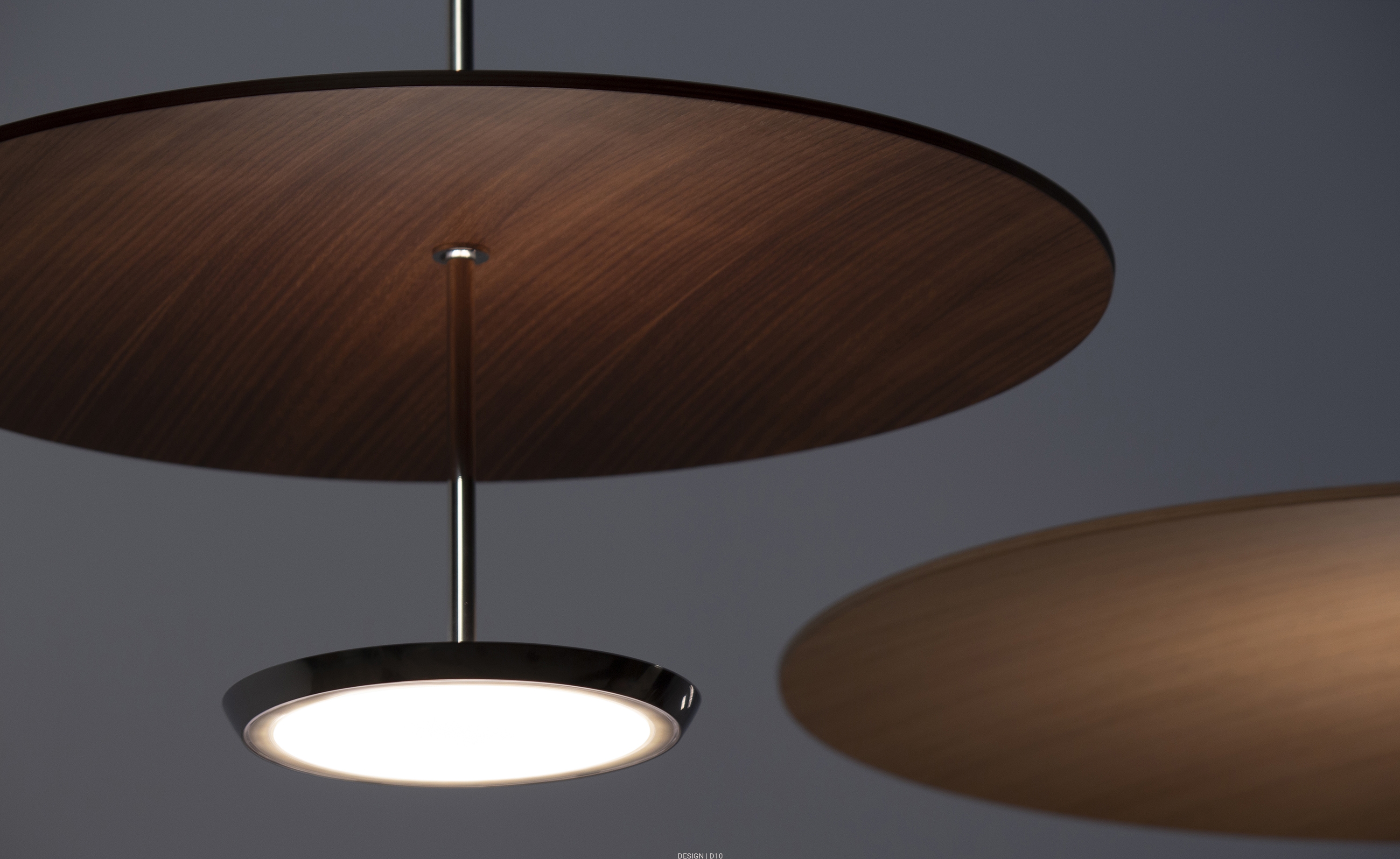Wykonanie: Konstrukcja z aluminium polerowanego lub malowanego na czarny matowy, dysk z metalu o kolorze matowy czarny / matowy biały / matowy mosiądz lub z drewna orzechowego / białego dębu
