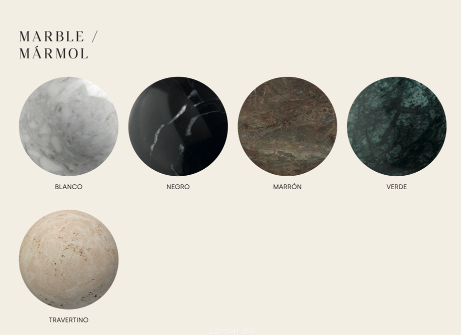 Wykończenie: metal o kolorze czarny mat, klosze o kolorze szatynowy nikiel, kamienne dyski z marmuru o kolorze czarnym, białym, zielonym, brązowym lub z trawertynu.