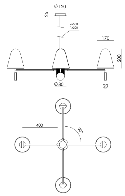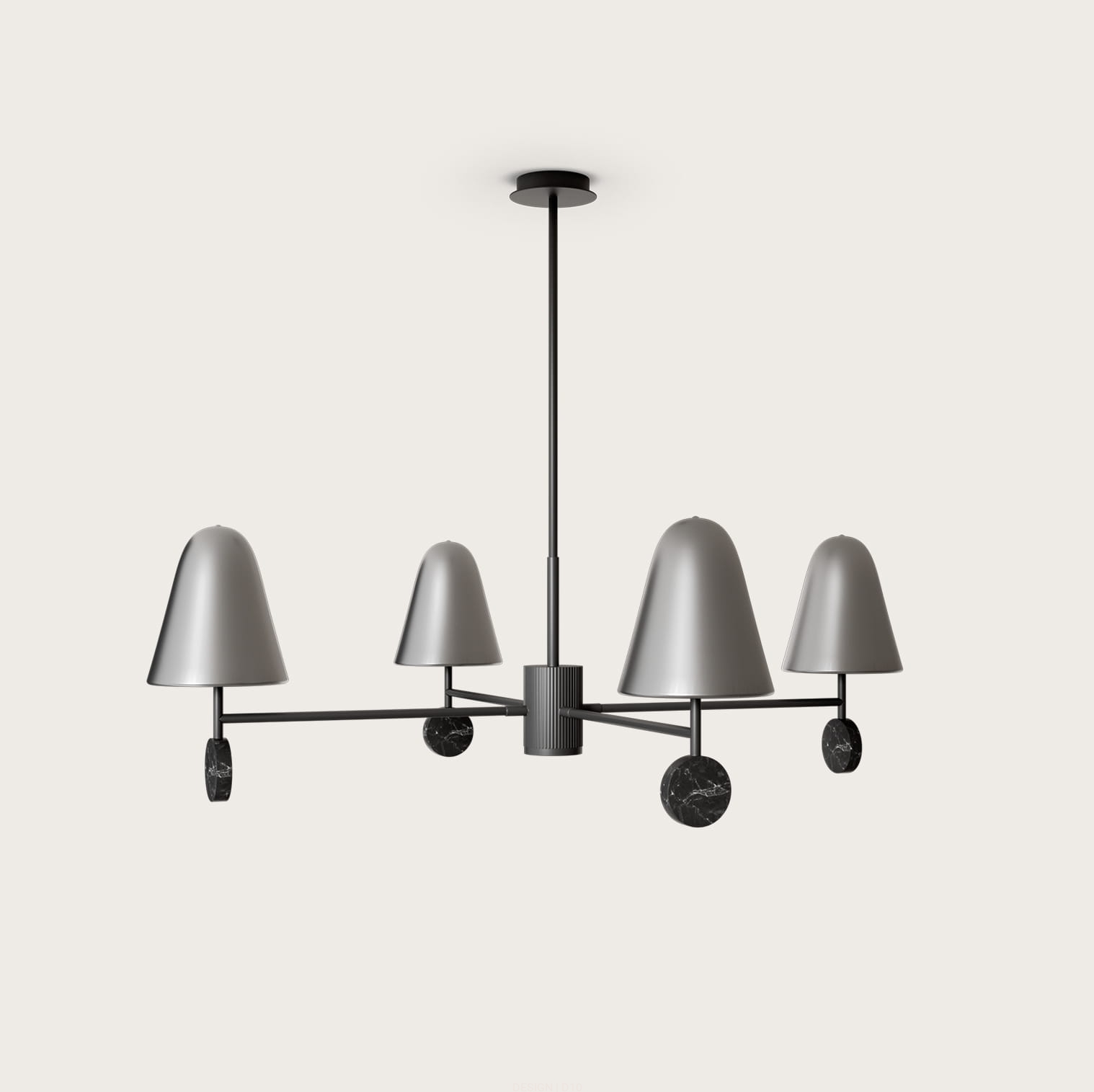 Wykończenie: metal o kolorze czarny mat, klosze o kolorze szatynowy nikiel, kamienne dyski z marmuru o kolorze czarnym, białym, zielonym, brązowym lub z trawertynu.