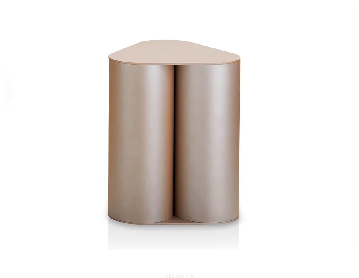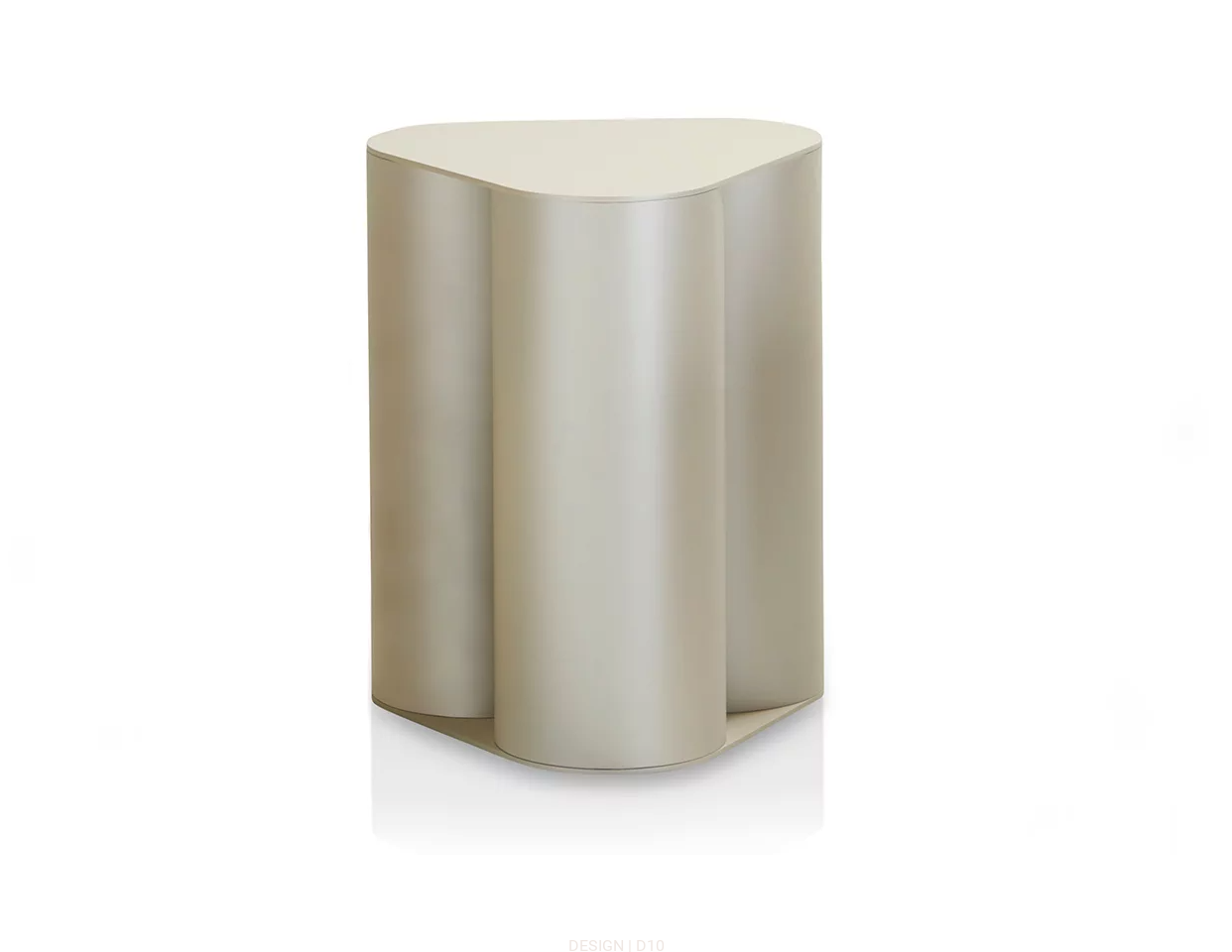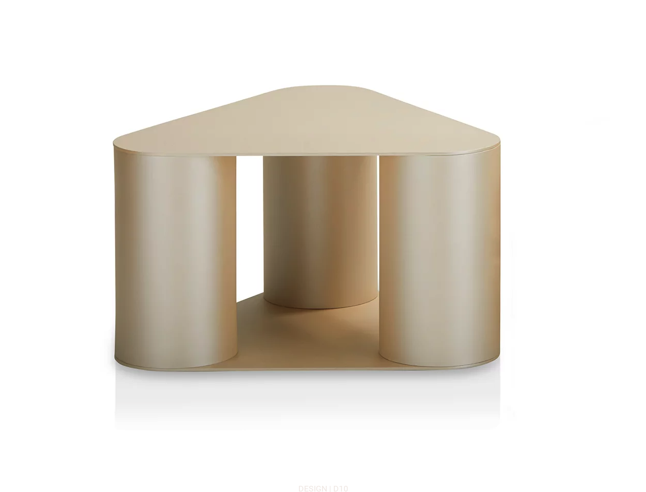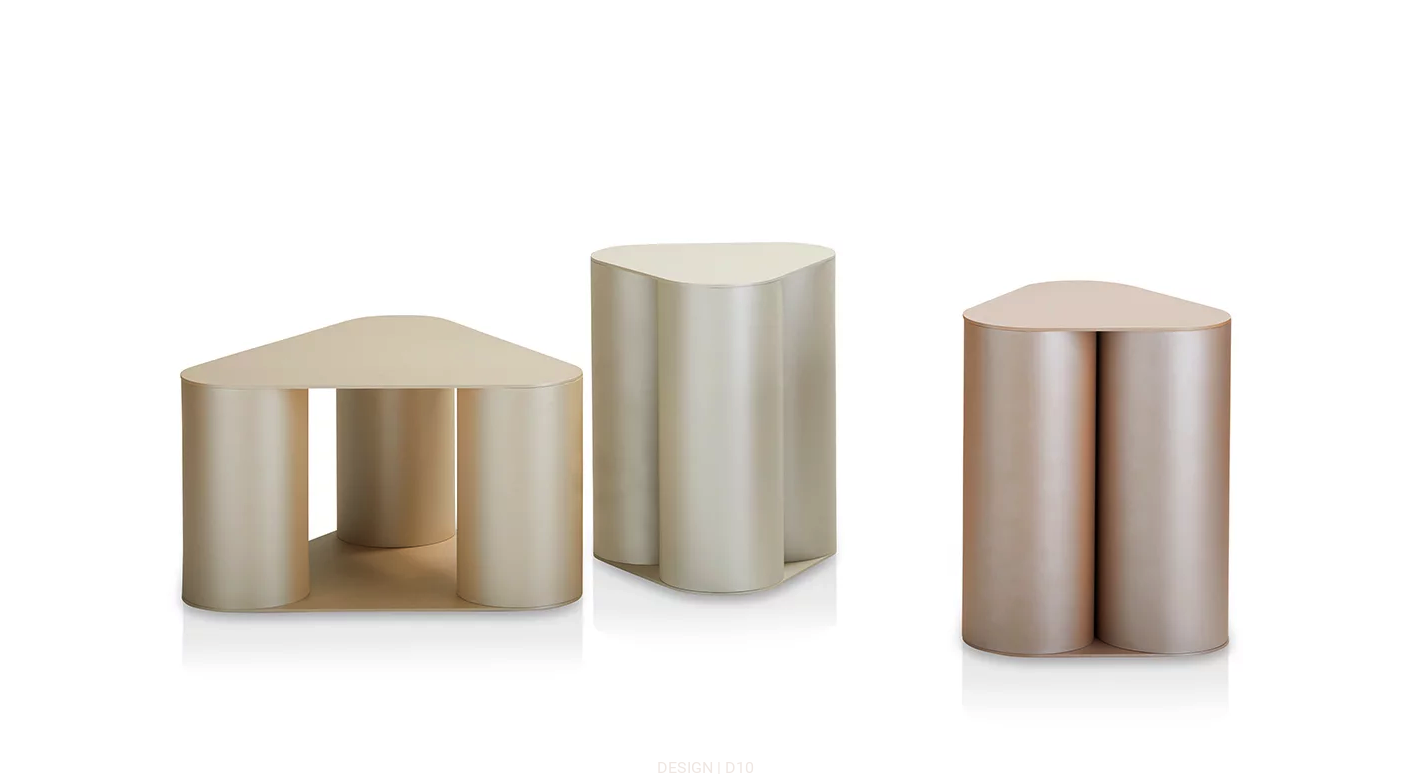 Niski stolik Tres to pierwszy projekt zaprojektowany przez Mut Design, duet kreatywny z Walencji, dla firmy Saba. Kolekcję charakteryzują dwie trójkątne powierzchnie o zaokrąglonych krawędziach, oddzielone od siebie trzema walcami nośnymi. Rzeźbiarskie bryły, dostępne w dwóch wymiarach, nabierają lekkości dzięki specjalnym opalizującym wykończeniom, które przypominają macicę perłową z muszli.