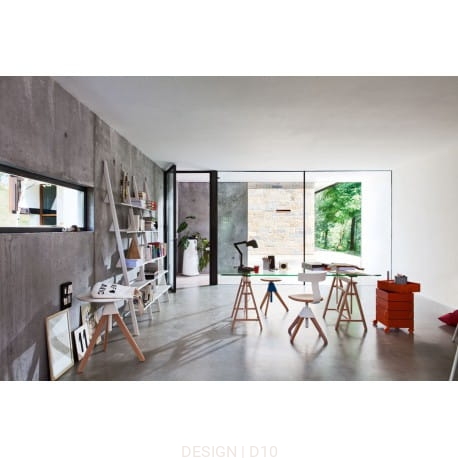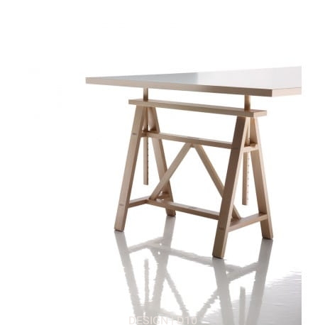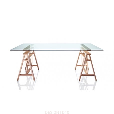 Stół Teatro o regulowanej wysokości powstał z inspiracji teatrem wędrownym, a ściślej mówiąc stołem na kozłach, który był wykorzystywany podczas występów. Taki stół od zawsze był też używany przez architektów, projektantów i artystów. Można przy nim pracować zarówno w pozycji siedzącej, jak i stojącej. Ułatwia to pracę nie tylko osobom, które dużo rysują, ale wszystkim, którym ciężko jest spędzić cały dzień w jednej pozycji. Teatro sprawdzi się także jako stół do jadalni w nowoczesnej aranżacji. Kozły zostały wykonane z litego drewna bukowego, natomiast blat ze szkła lub z płyty MDF.