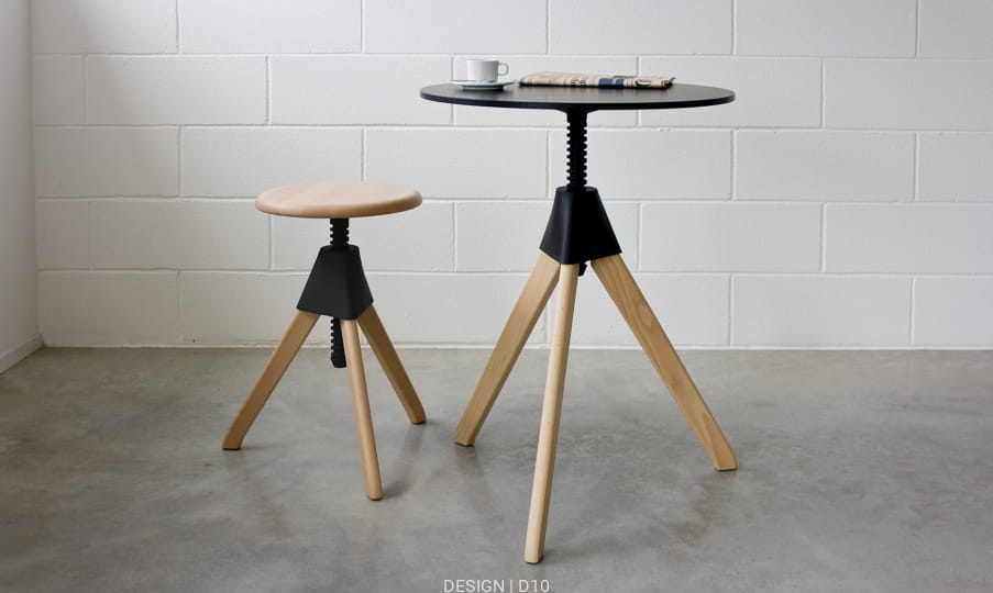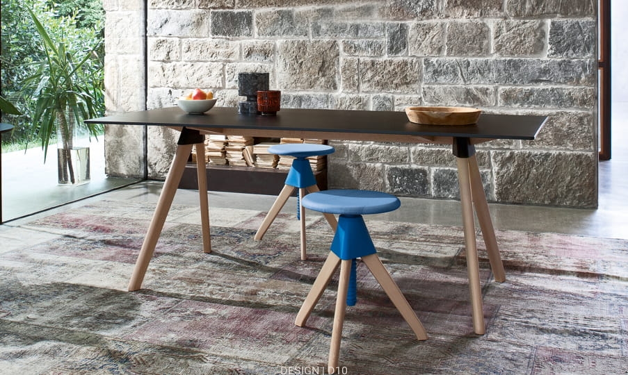 Stołek obrotowy o regulowanej wysokości Jerry z kolekcji The Wild Bunch to nowoczesna wersja klasycznego stołka z warsztatu rzemieślniczego. Występuje w dwóch rozmiarach - wyższy (Tom) i niższy (Jerry). Tradycyjne okrągłe siedzisko i trójnóg wykonano z drewna bukowego, złącze i śruba są z polipropylenu wzmocnionego włóknem szklanym. Siedzisko dostępne jest w siedmiu kolorach: czarny, biały, pomarańczowy, czerwony, niebieski, zielony i żółty, trójnóg w kolorze naturalnego buku. Jest też model w całości czarny. Dzięki zastosowanej konstrukcji można wyjątkowo łatwo dostosować wysokość stołka do wysokości blatu, więc doskonale sprawdzi się w kuchni, w pracowni, czy w barze.