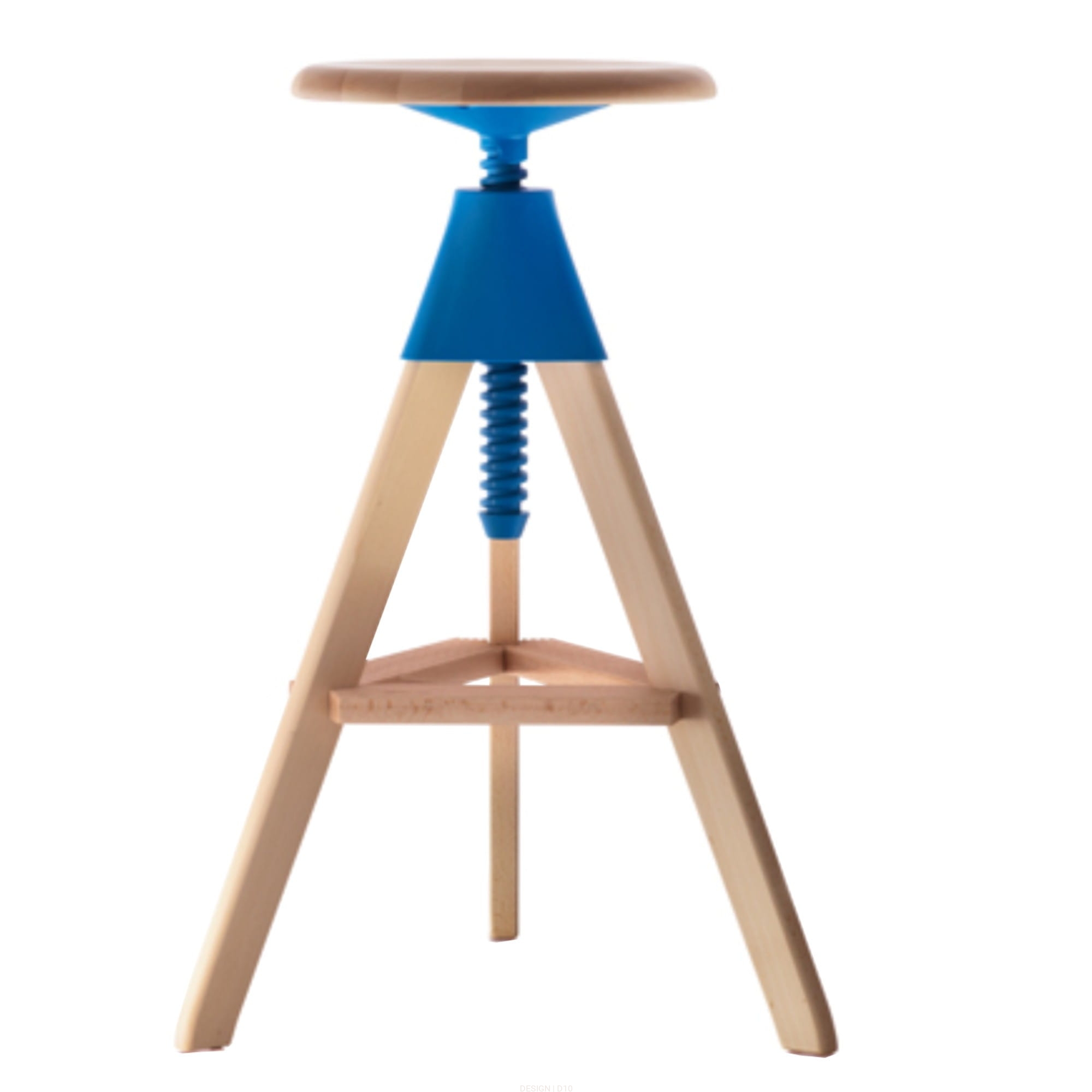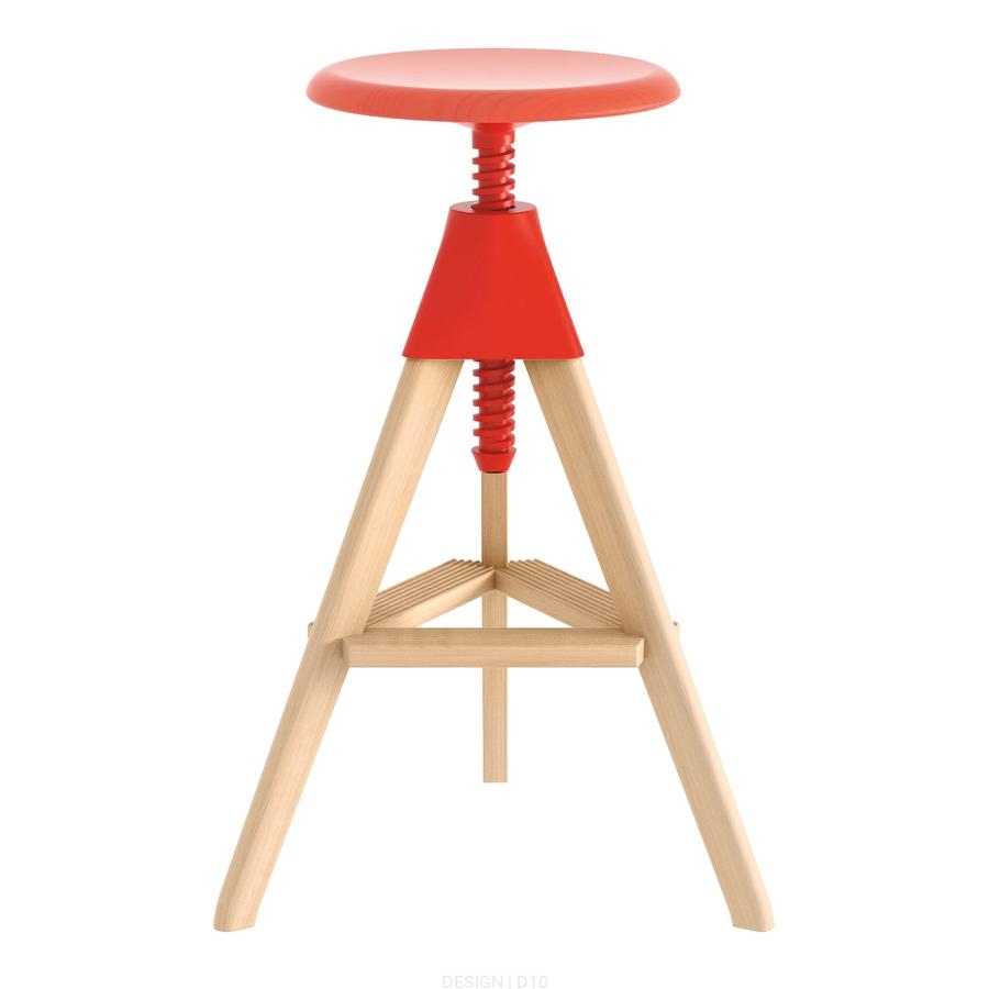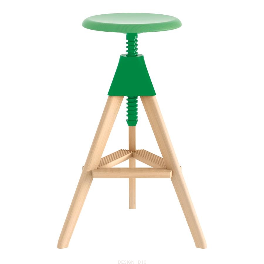 Stołek obrotowy o regulowanej wysokości Tom z kolekcji The Wild Bunch to nowoczesna wersja klasycznego stołka z warsztatu rzemieślniczego. Występuje w dwóch rozmiarach - wyższy (Tom) i niższy (Jerry). Tradycyjne okrągłe siedzisko i trójnóg wykonano z drewna bukowego, złącze i śruba są z polipropylenu wzmocnionego włóknem szklanym. Siedzisko dostępne jest w siedmiu kolorach: czarny, biały, pomarańczowy, czerwony, niebieski, zielony i żółty, trójnóg w kolorze naturalnego buku. Jest też model w całości czarny. Dzięki zastosowanej konstrukcji można wyjątkowo łatwo dostosować wysokość stołka do wysokości blatu, więc doskonale sprawdzi się w kuchni, w pracowni, czy w barze.