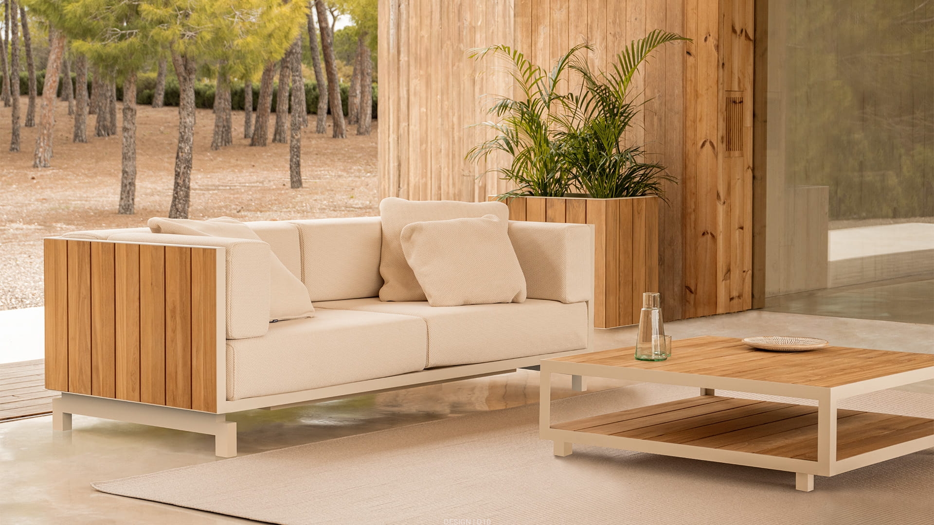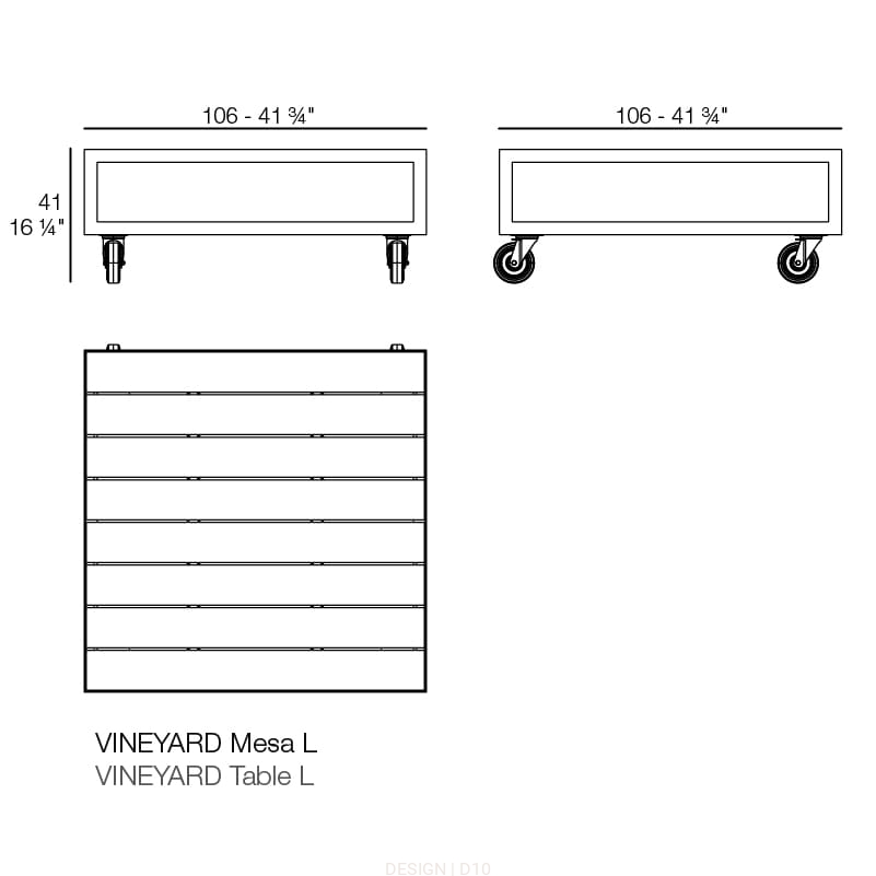 Vineyard to to kolekcja outdoorowych mebli zaprojektowanych przez Ramóna Esteve. Charakteryzuje się aluminiowymi i drewnianymi konstrukcjami oraz rustykalnym, ciepłym charakterem. Stolik odznacza się tekową obudową w dwóch dostępnych wykończeniach: naturalny i wyblakły. Dzięki zamontowanym kółkom stolik staje się niezwykle mobilny i ekspresyjny.